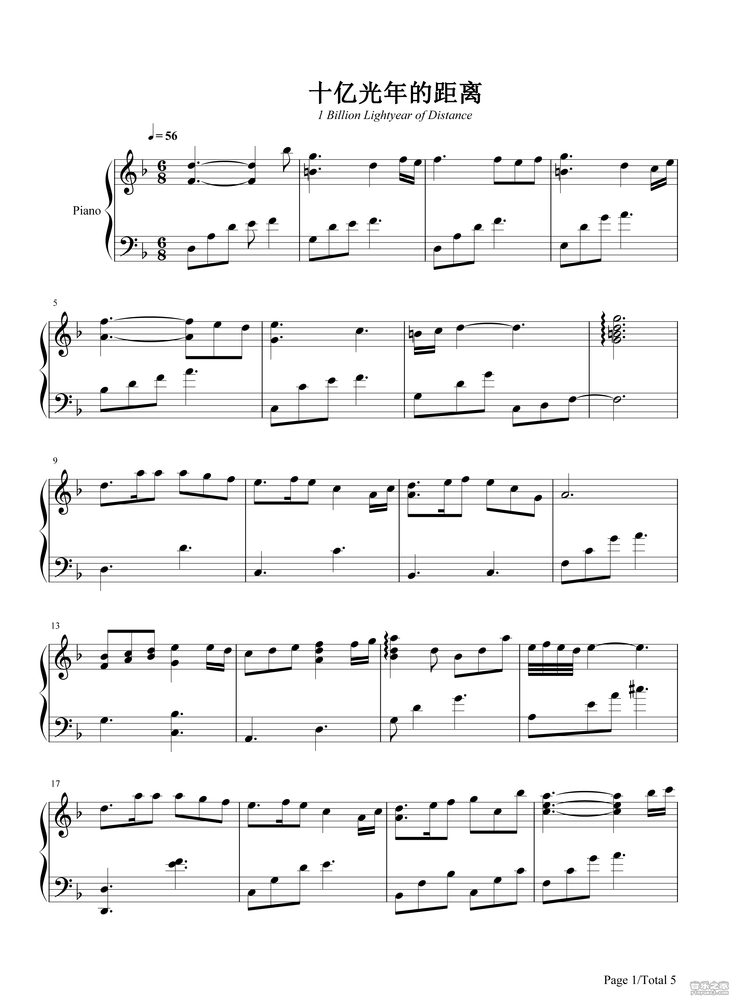 钢琴《十亿光年的距离》钢琴五线谱