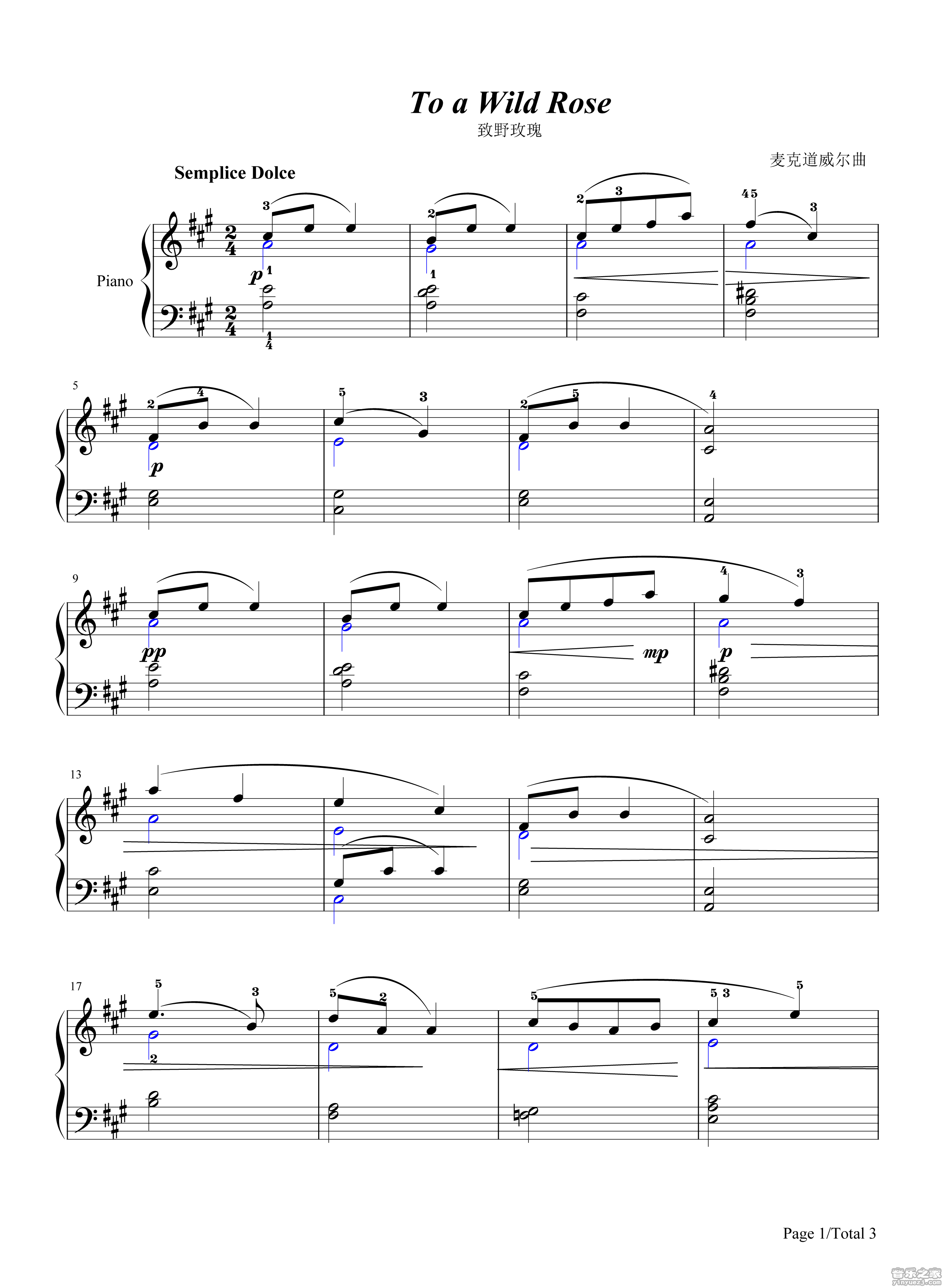 EdwardMacDowell《致野玫瑰》钢琴谱,采用C调指法编配,共有3张高清图谱。...