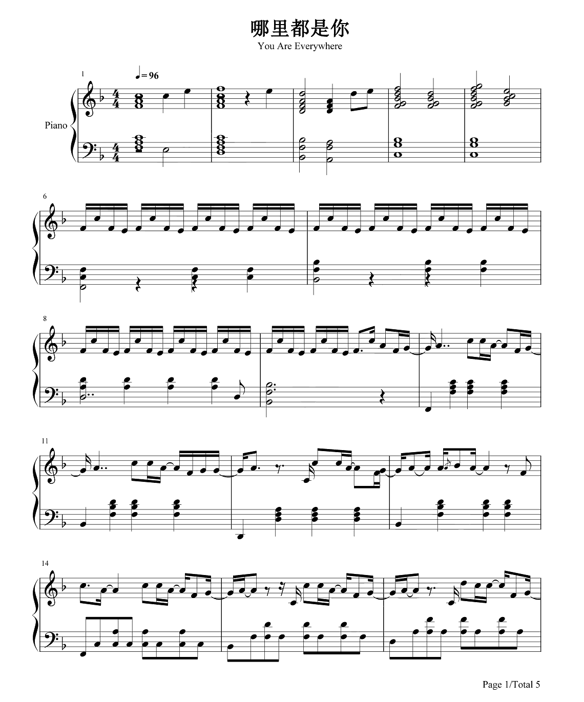 钢琴《天台爱情》主题曲《哪里都是你》钢琴谱