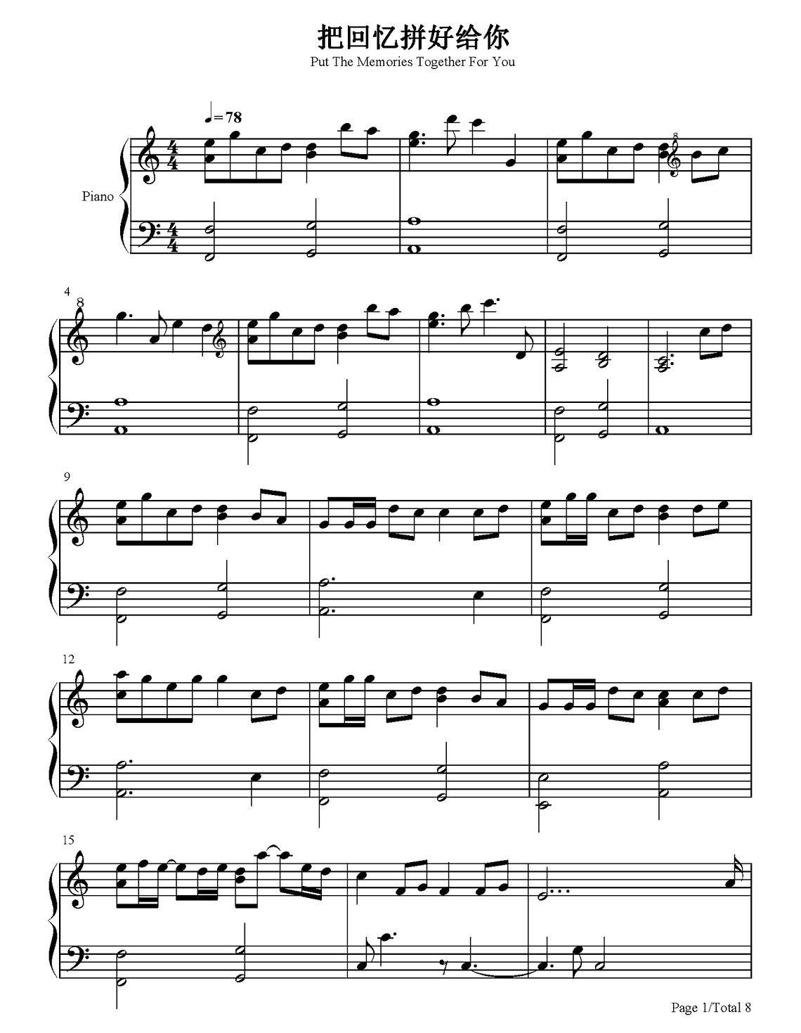 钢琴王贰浪《把回忆拼好给你》钢琴谱