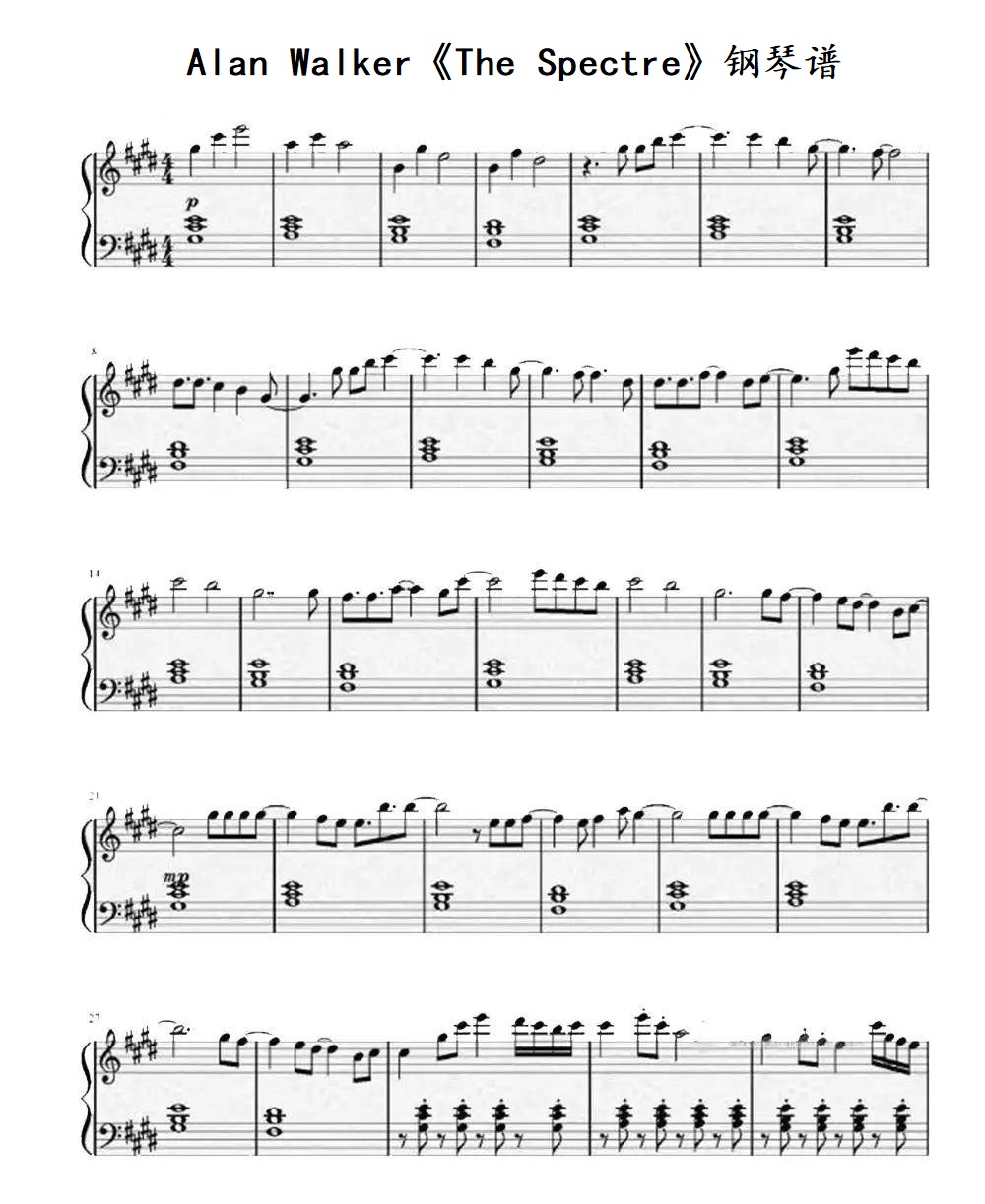 AlanWalker《TheSpectre》钢琴谱,采用E调指法编配,共有4张高清图谱。...