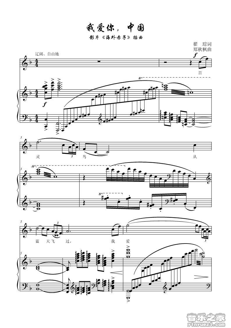 钢琴叶佩英《我爱你,中国》钢琴F调正谱
