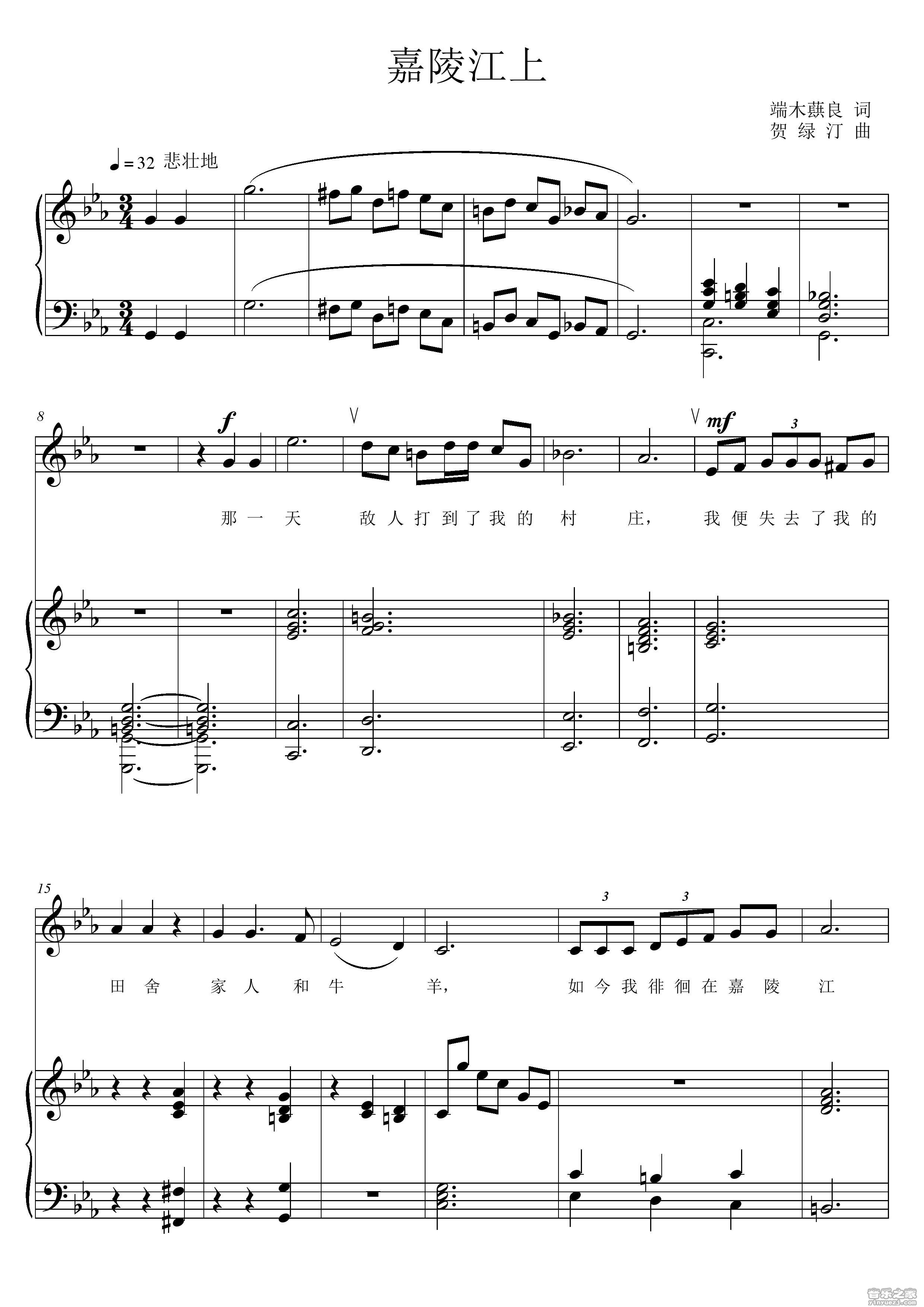 廖昌永《嘉陵江上》钢琴谱,采用C调指法编配,共有3张高清图谱。...