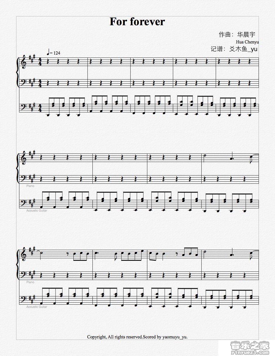 华晨宇《Forforever》钢琴谱,采用C调指法编配,共有1张高清图谱,免翻页排版设计。...