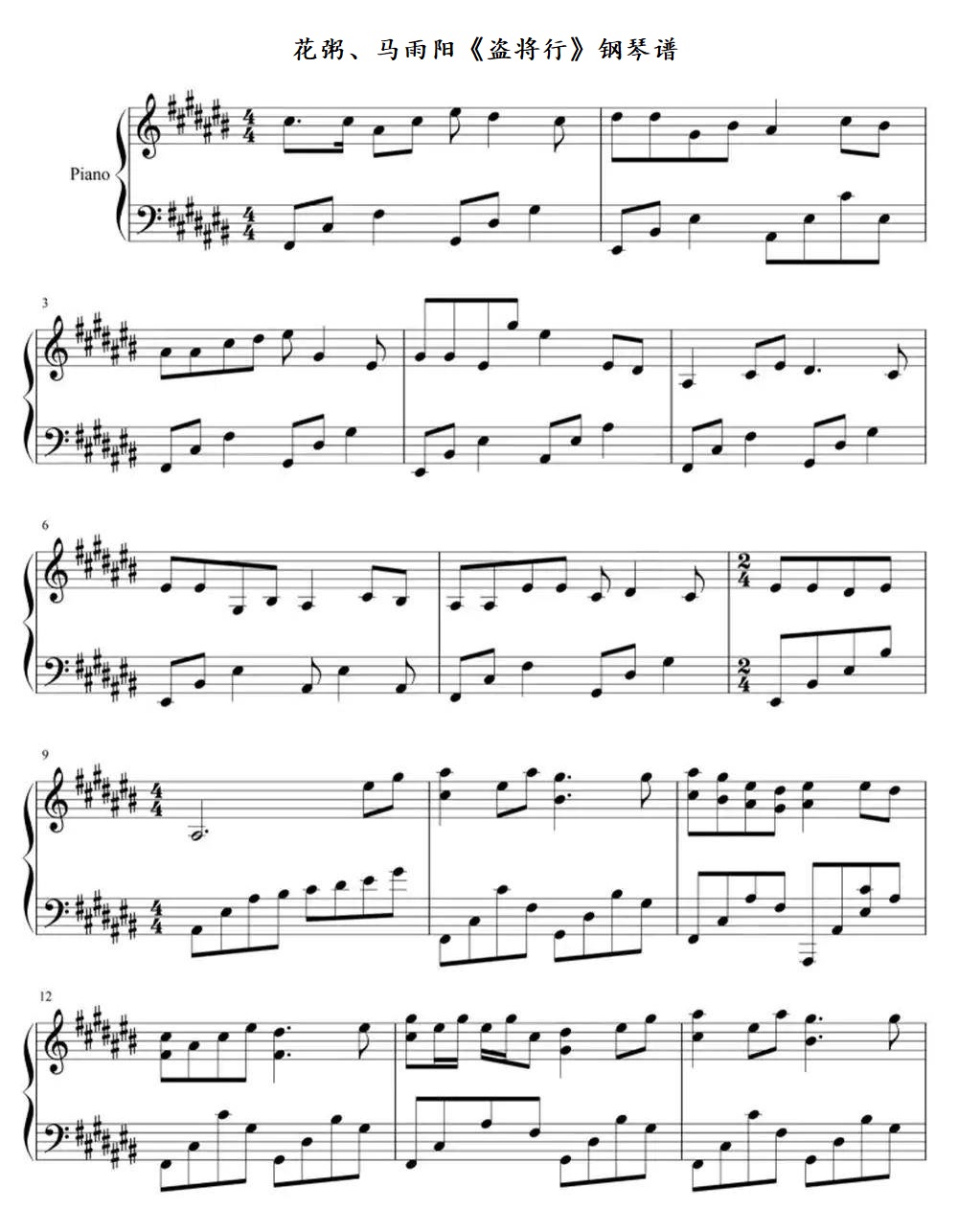 钢琴花粥、马雨阳《盗将行》钢琴谱
