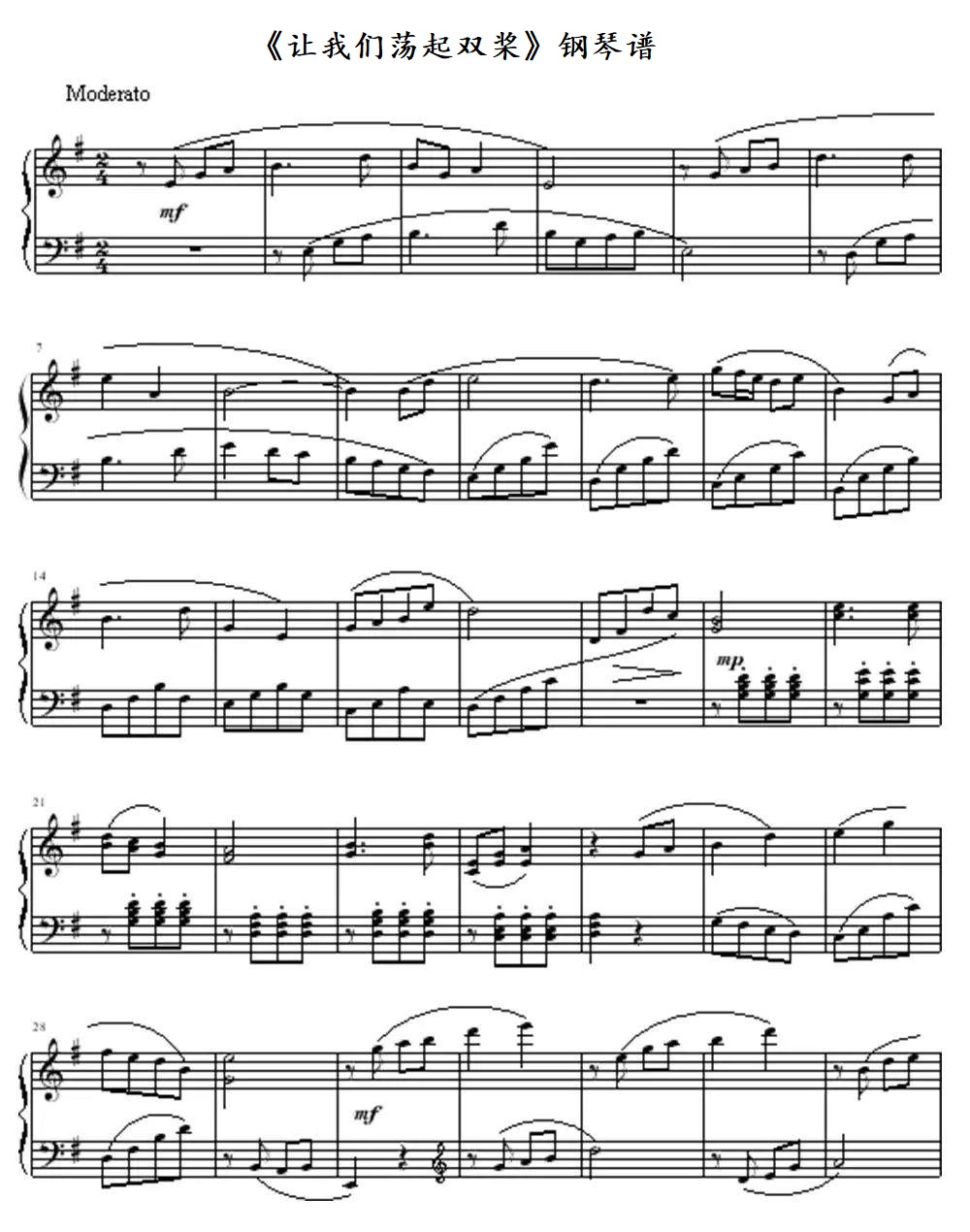 《让我们荡起双桨》钢琴谱,采用G调指法编配,共有2张高清图谱,免翻页排版设计。...