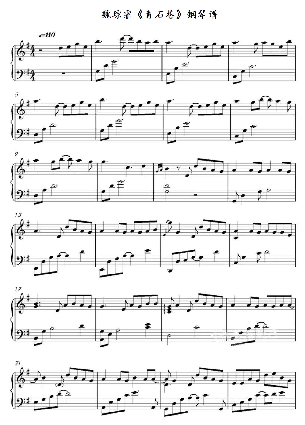 魏琮霏《青石巷》钢琴谱,采用G调指法编配,共有4张高清图谱。...