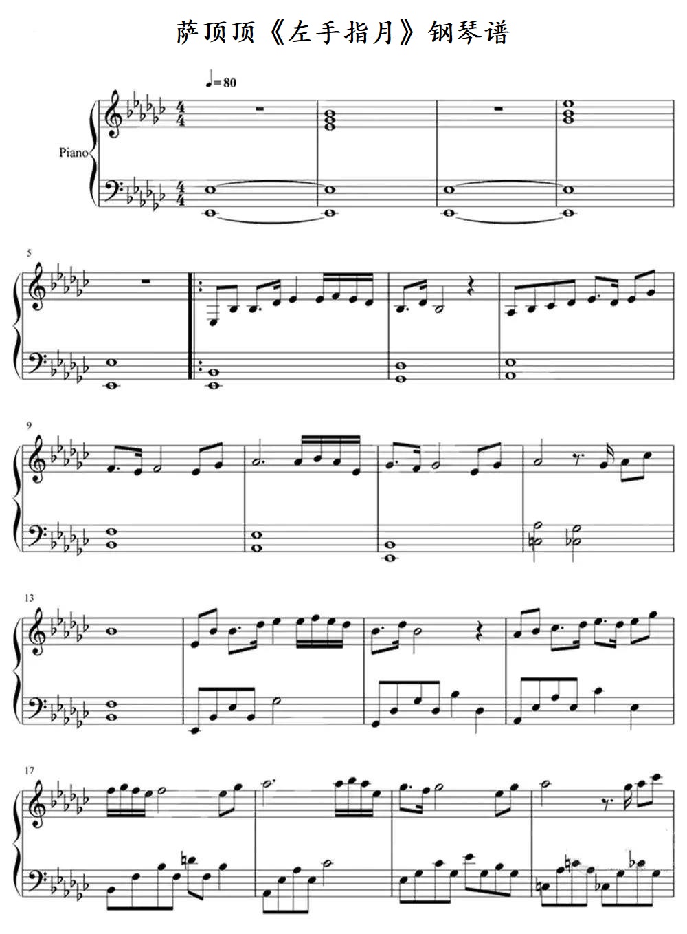 《左手指月》钢琴谱,采用F#调指法编配,共有3张高清图谱。...