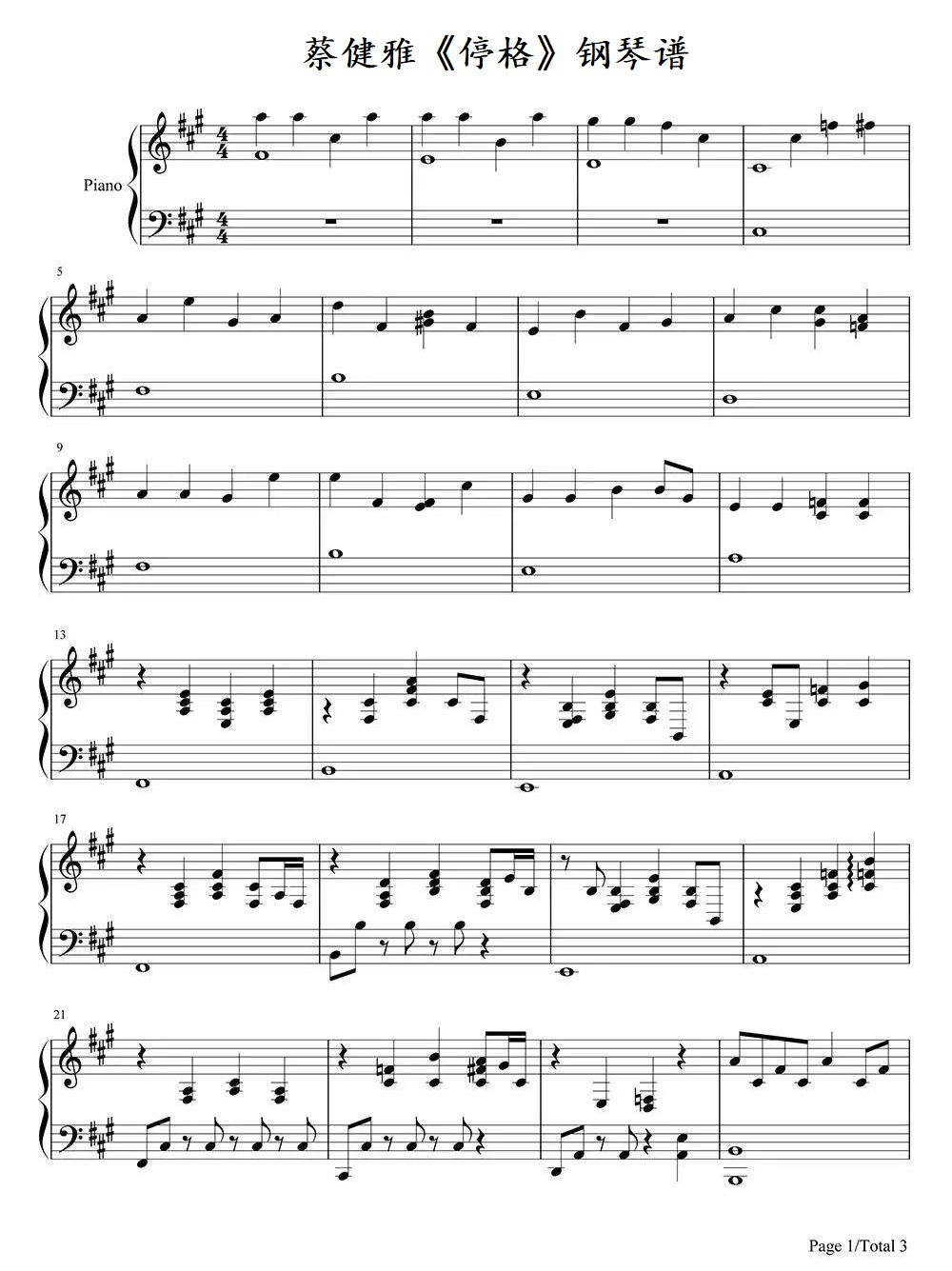 蔡健雅《停格》钢琴谱...