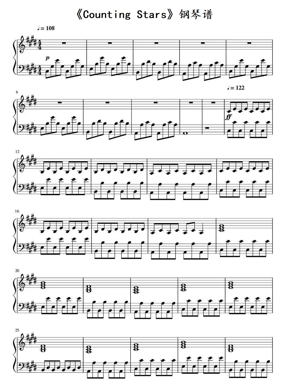 摇滚乐队共和时代《CountingStars》钢琴谱,采用C调指法编配,共有4张高清图谱。...