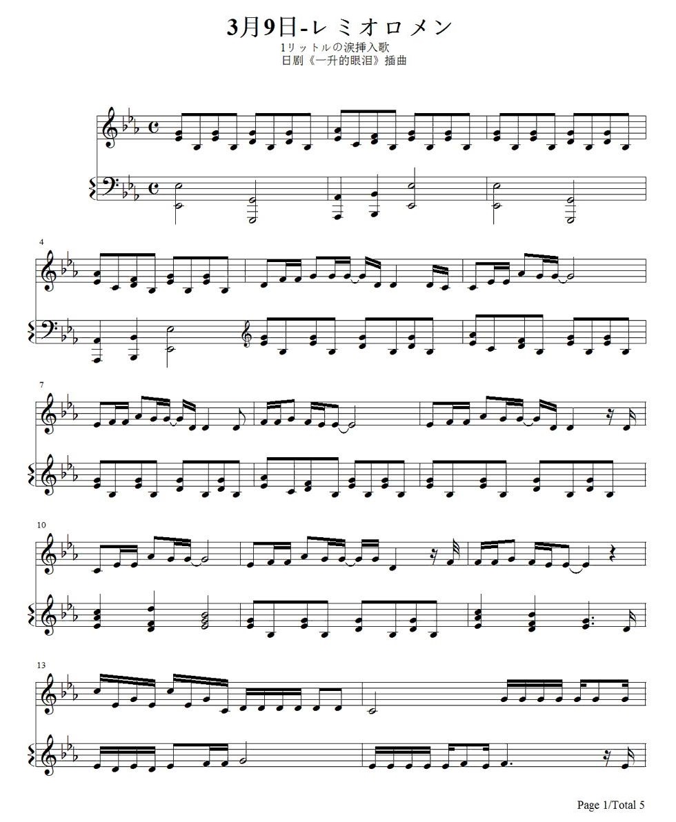 钢琴《一公升的眼泪》插曲《3月9日》钢琴谱