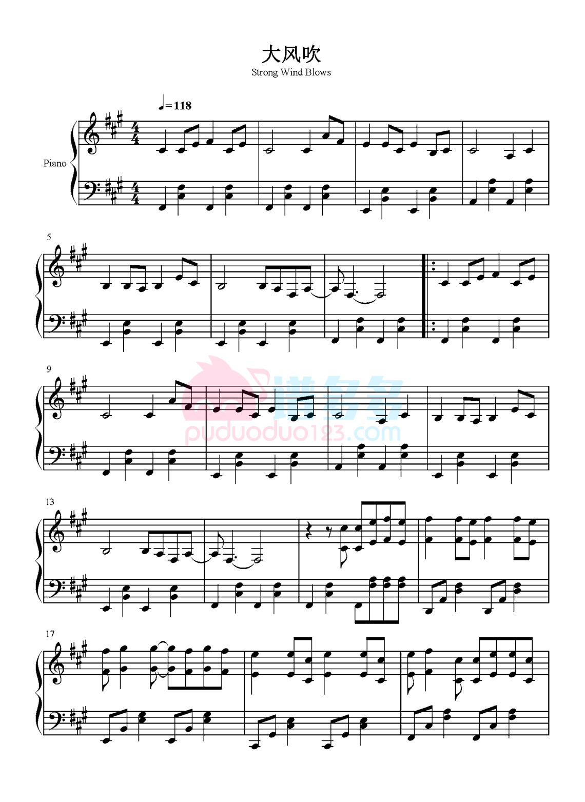 钢琴王赫野《大风吹》钢琴五线谱
