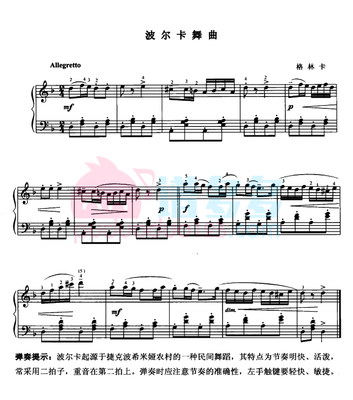 《波尔卡舞曲》钢琴谱,采用C调指法编配,共有1张高清图谱,免翻页排版设计。...