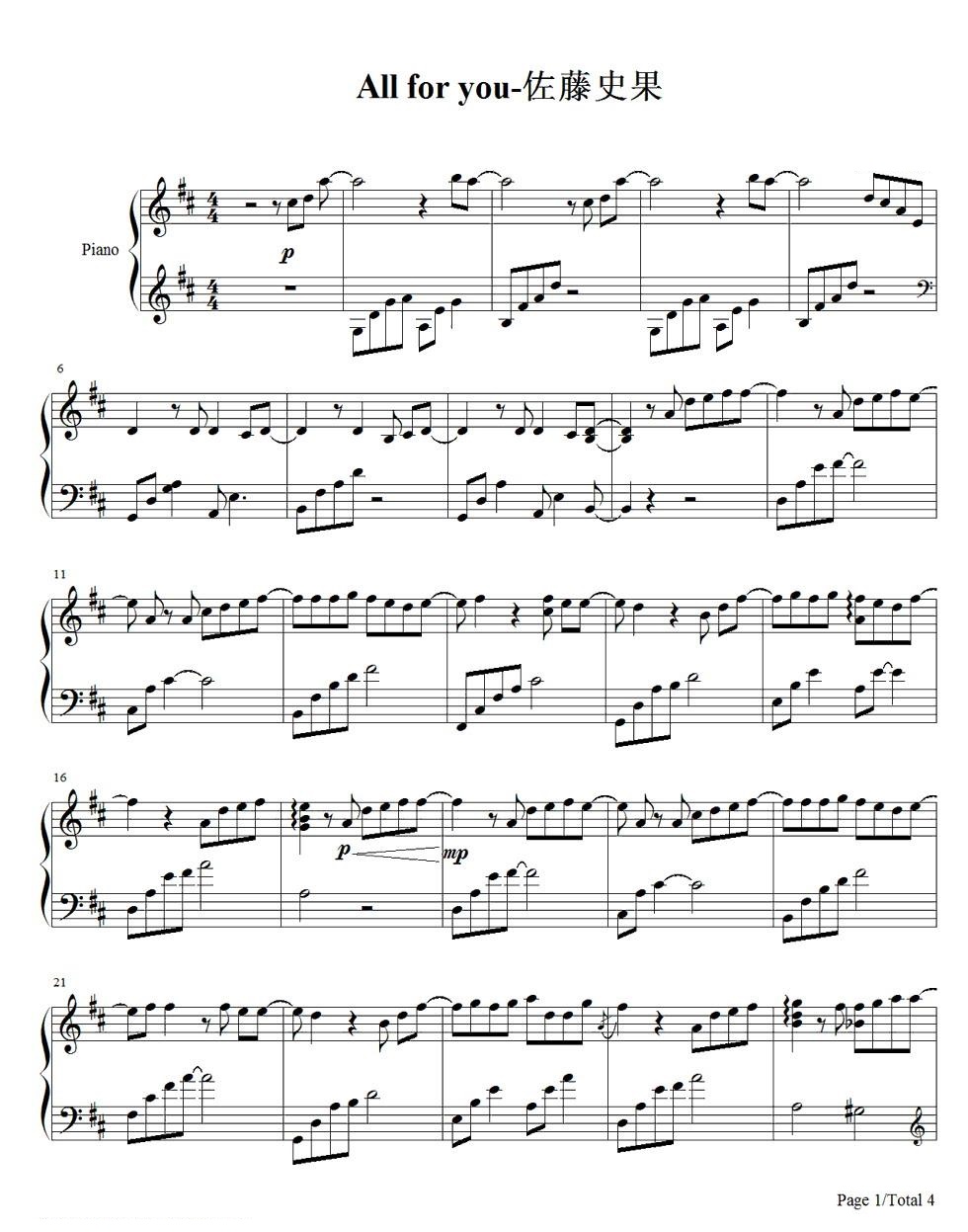 佐藤史果《AllForYou》钢琴谱,采用C调指法编配,共有4张高清图谱。...