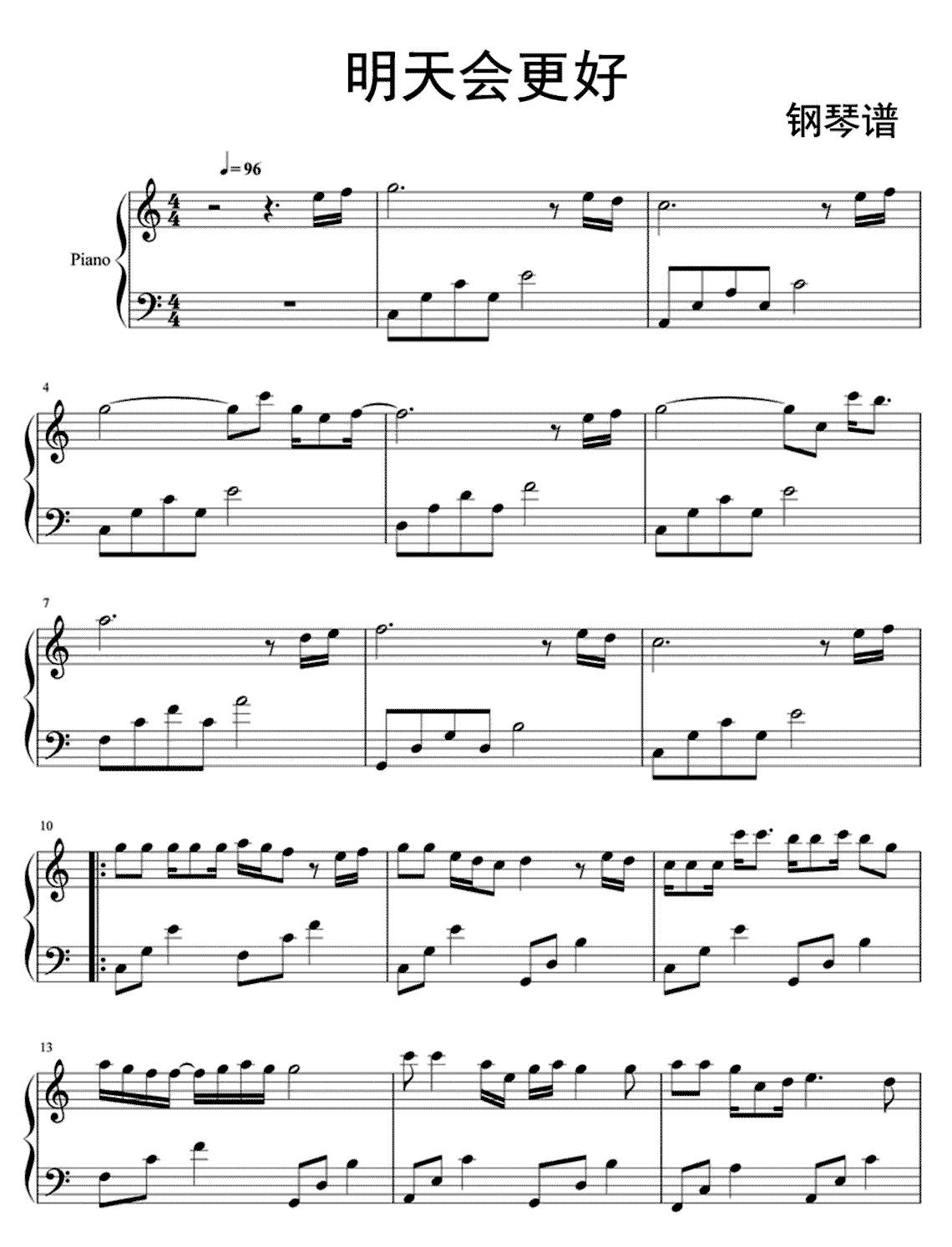 《明天会更好》钢琴谱,采用C调指法编配,共有3张高清图谱。...