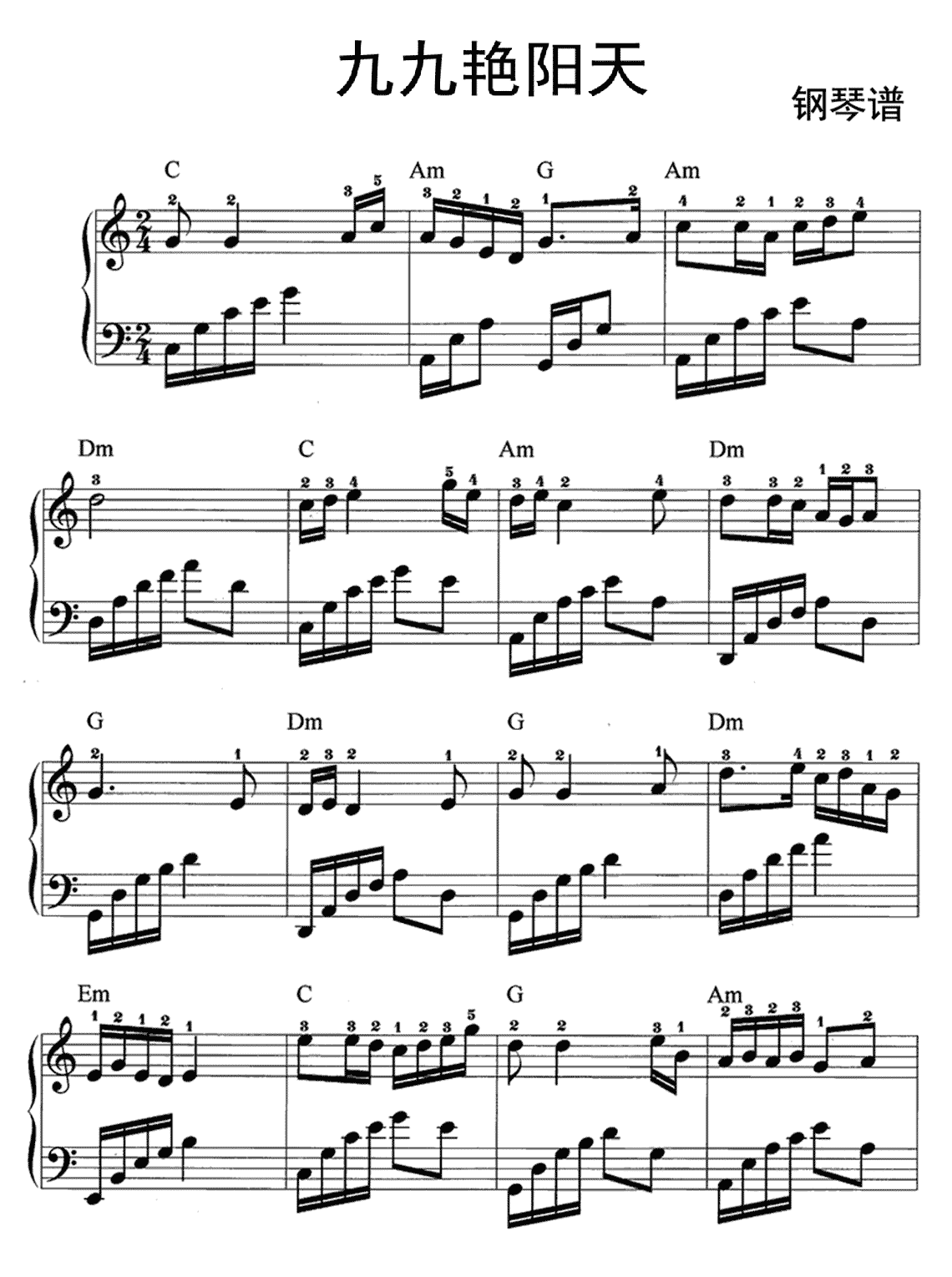 《九九艳阳天》钢琴谱,采用C调指法编配,共有2张高清图谱,免翻页排版设计。...