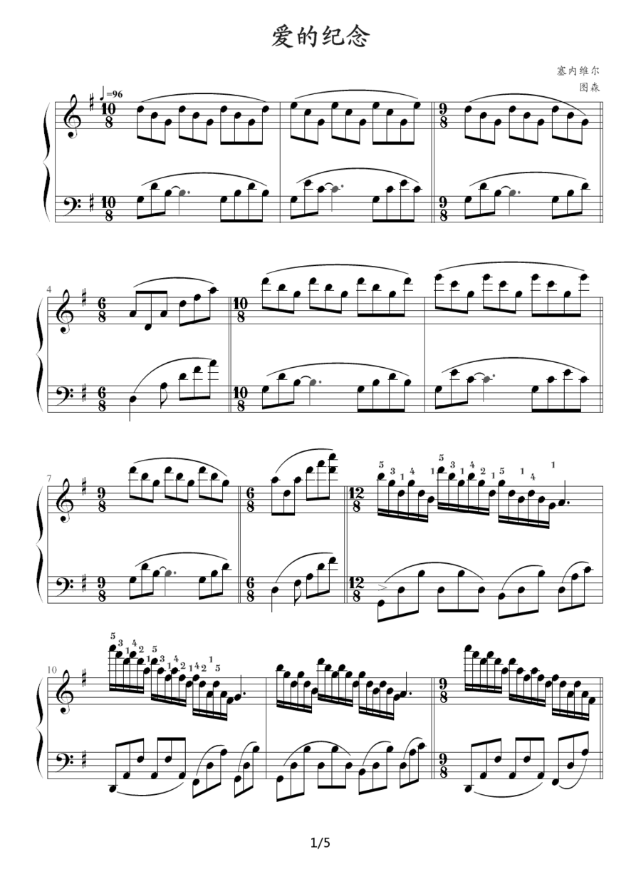 《爱的纪念》钢琴谱,采用C调指法编配,共有5张高清图谱。...