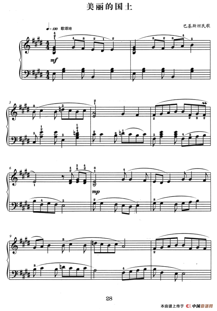 《美丽的国土(巴基斯坦民歌、杜亚雄编配版)》钢琴谱,采用E调指法编配,共有2张高清图谱,免翻页排版设计。...