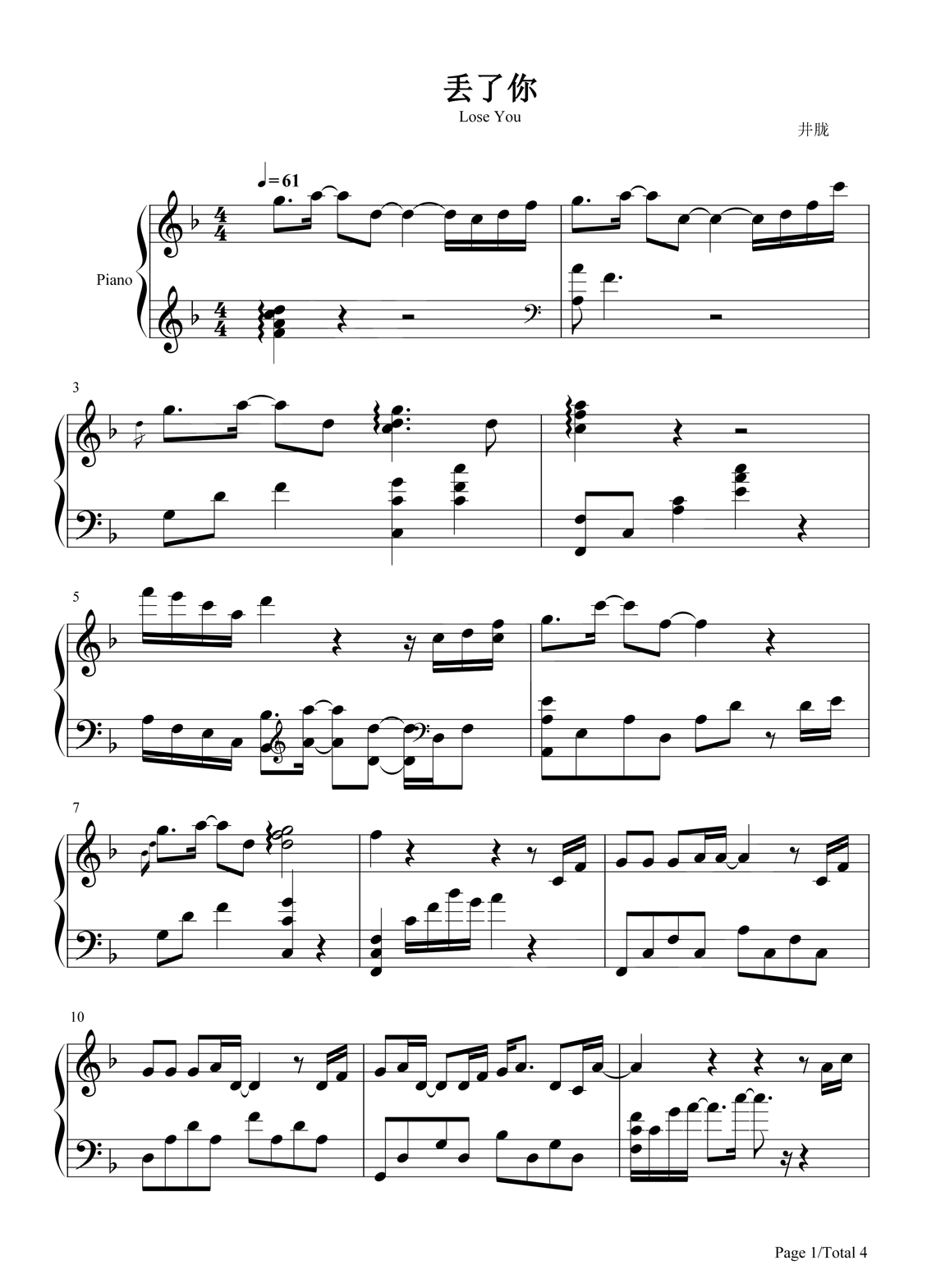 井胧《丢了你》钢琴谱,采用C调指法编配,共有4张高清图谱。...
