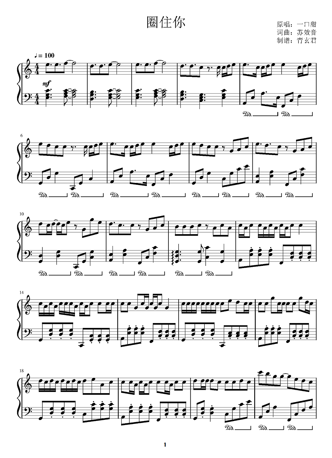 一口甜《圈住你》钢琴谱,采用C调指法编配,共有3张高清图谱。...