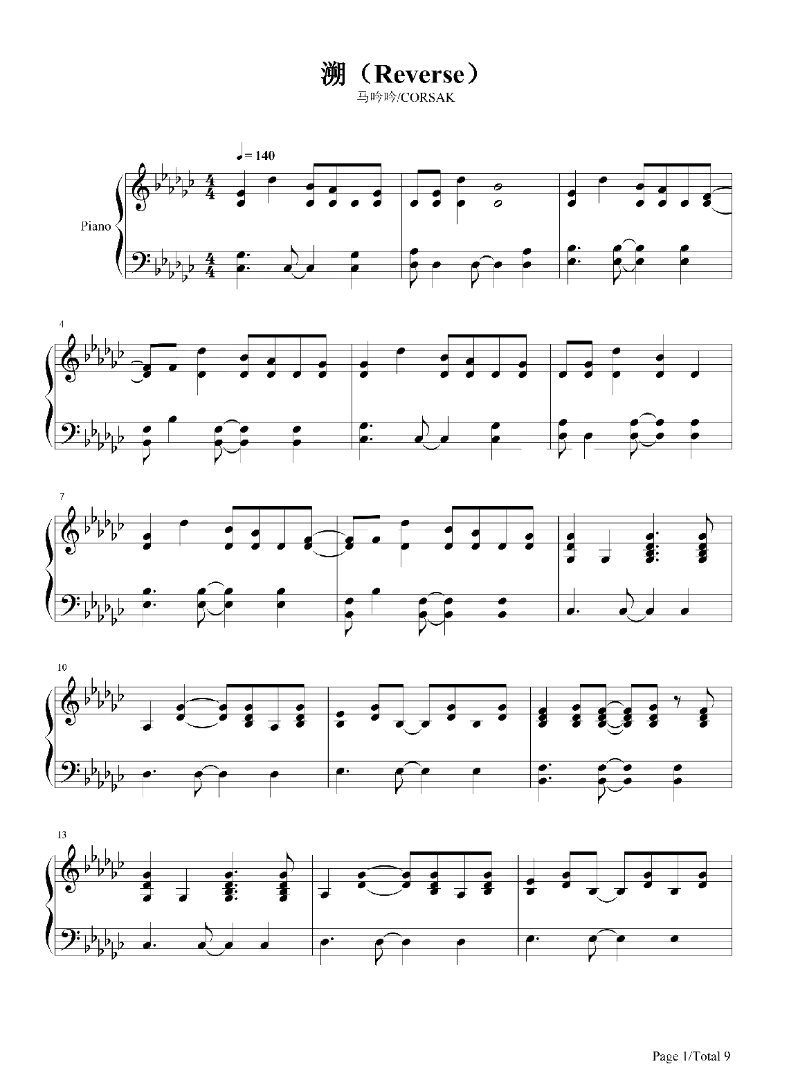 《溯(Reverse)》钢琴谱,采用C调指法编配,共有9张高清图谱。...