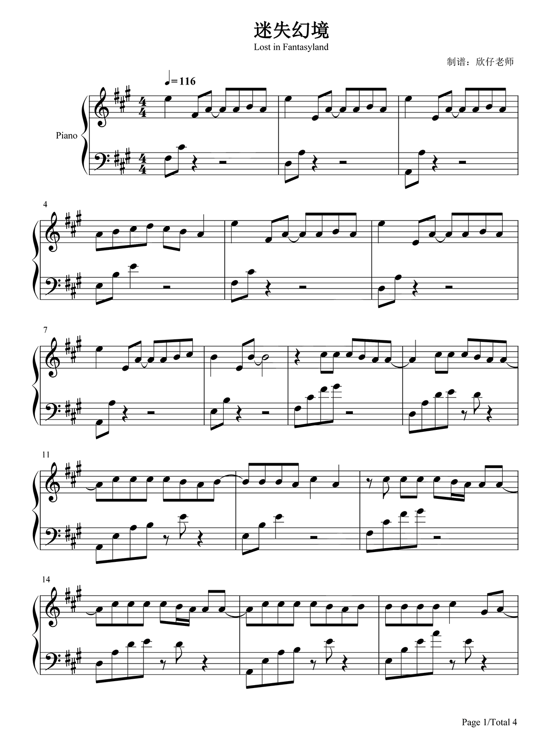 《迷失幻境》钢琴谱,采用F调指法编配,共有3张高清图谱。...