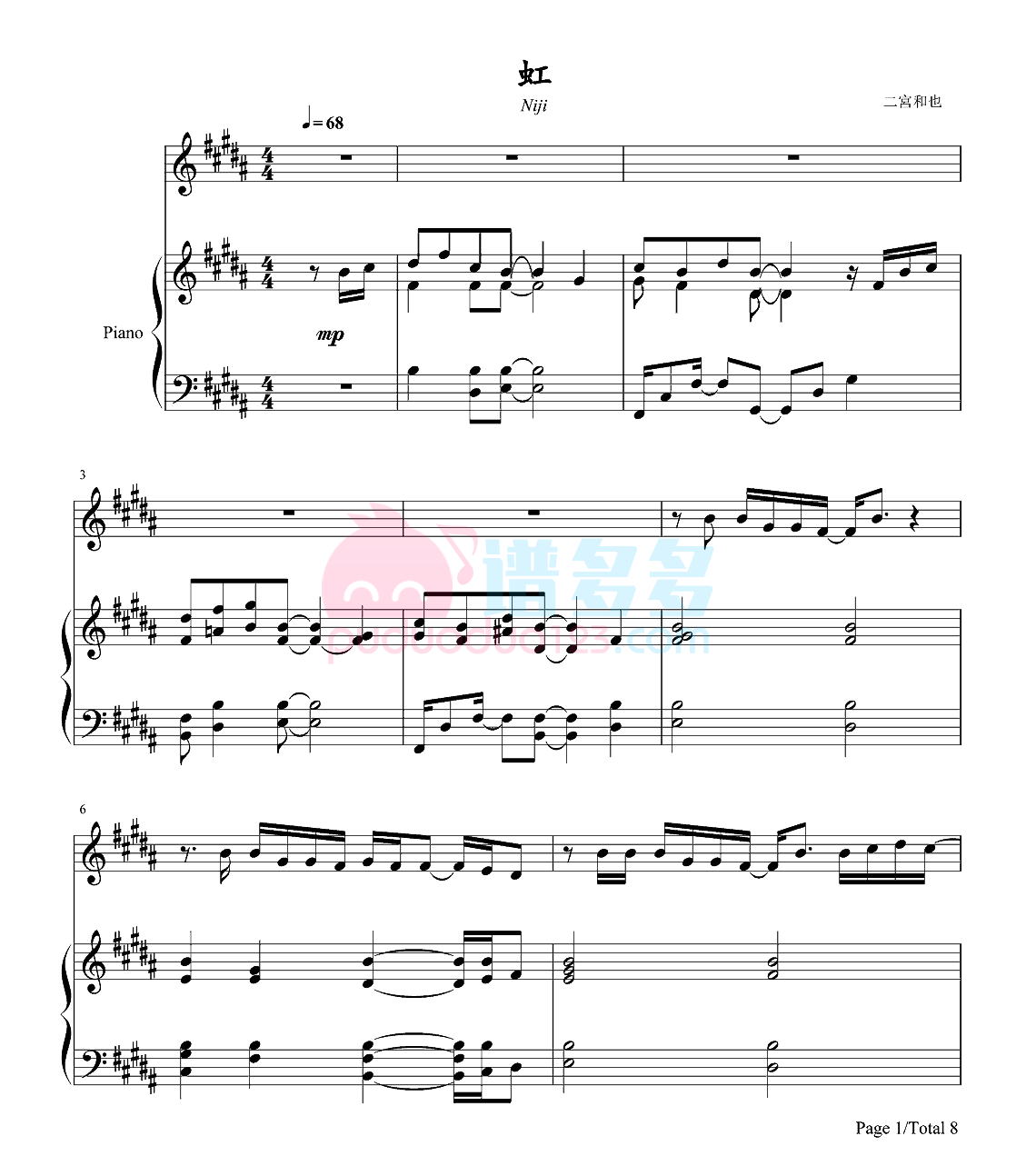 二宫和也《虹》钢琴谱,采用C调指法编配,共有8张高清图谱。...