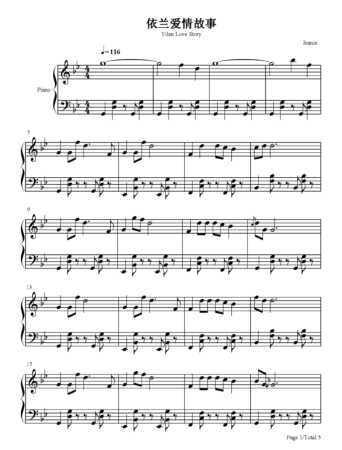 贾玲、方磊《依兰爱情故事》钢琴谱,采用11调指法编配,共有5张高清图谱。...