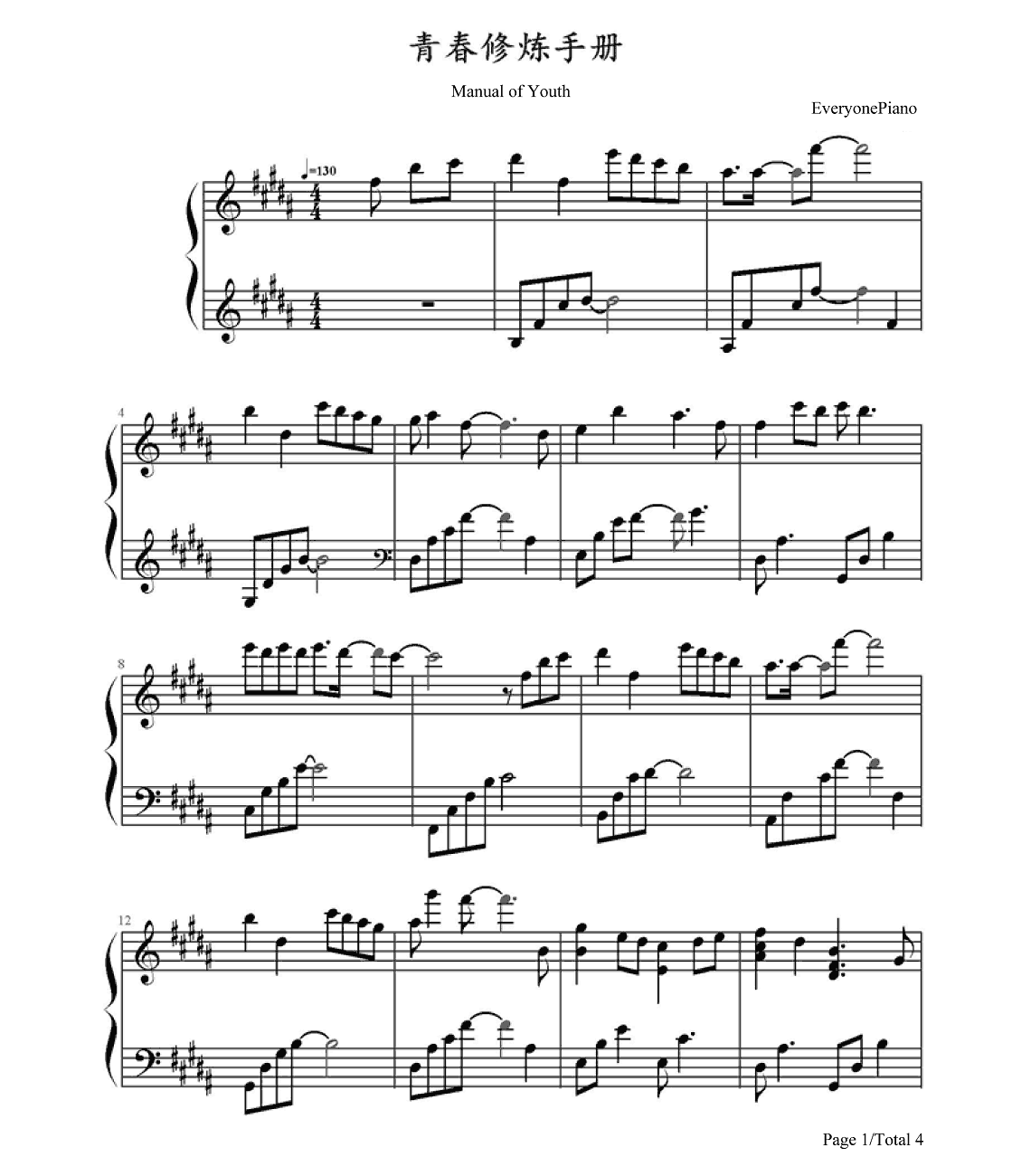 TFBOYS《青春修炼手册》钢琴谱,采用12调指法编配,共有4张高清图谱。...