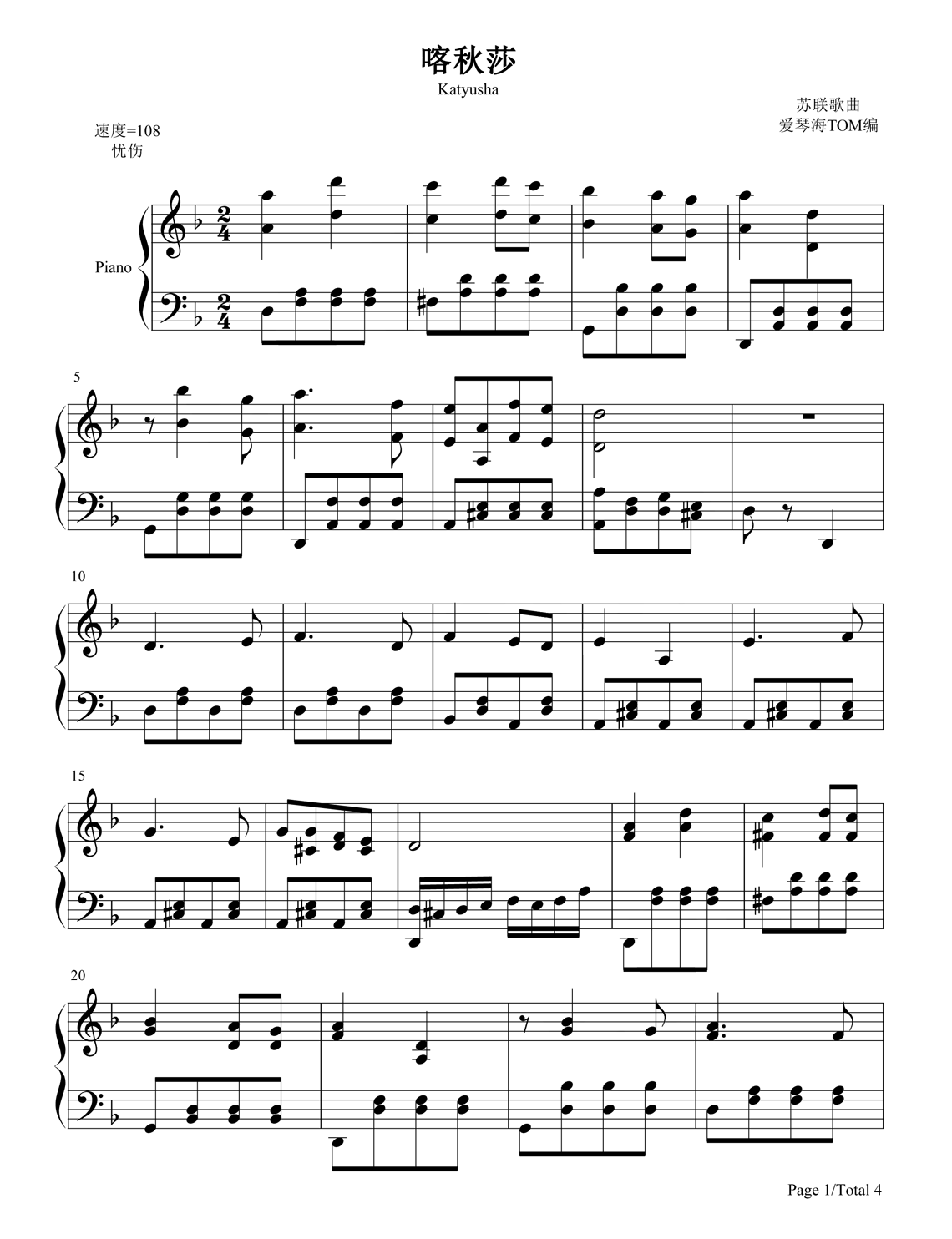 《喀秋莎》钢琴谱,采用F调指法编配,共有4张高清图谱。...