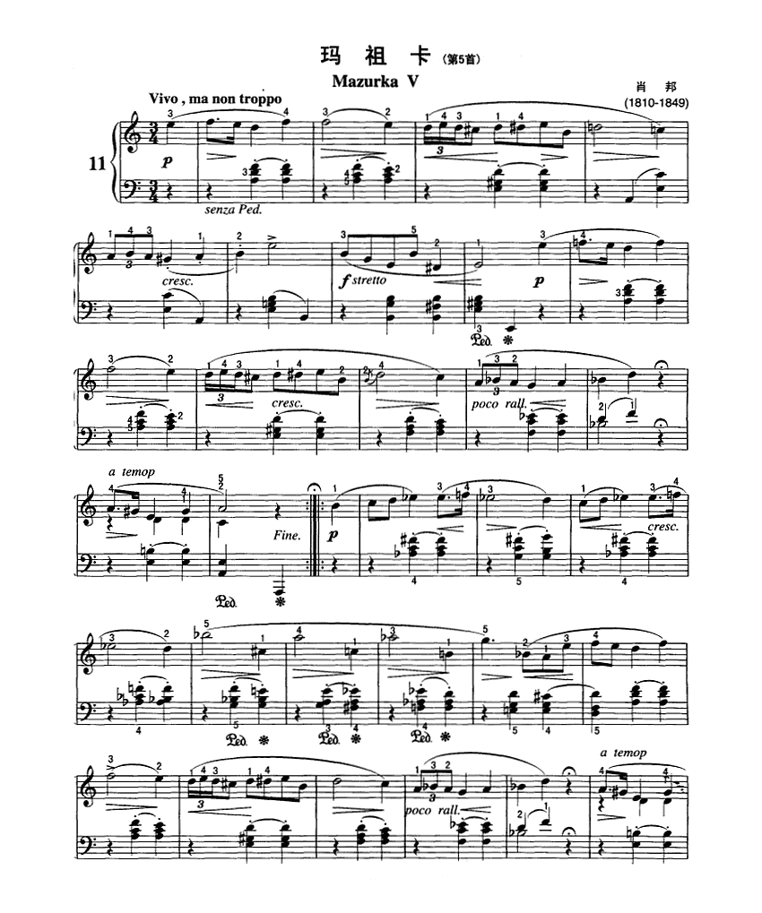 傅聪演奏版《玛祖卡》钢琴谱,采用C调指法编配,共有2张高清图谱,免翻页排版设计。...