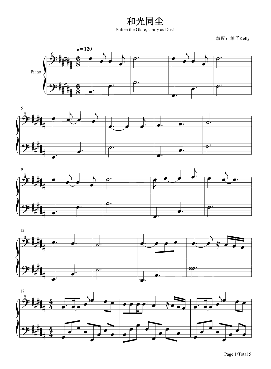 周深《和光同尘》钢琴谱,采用C调指法编配,共有5张高清图谱。...
