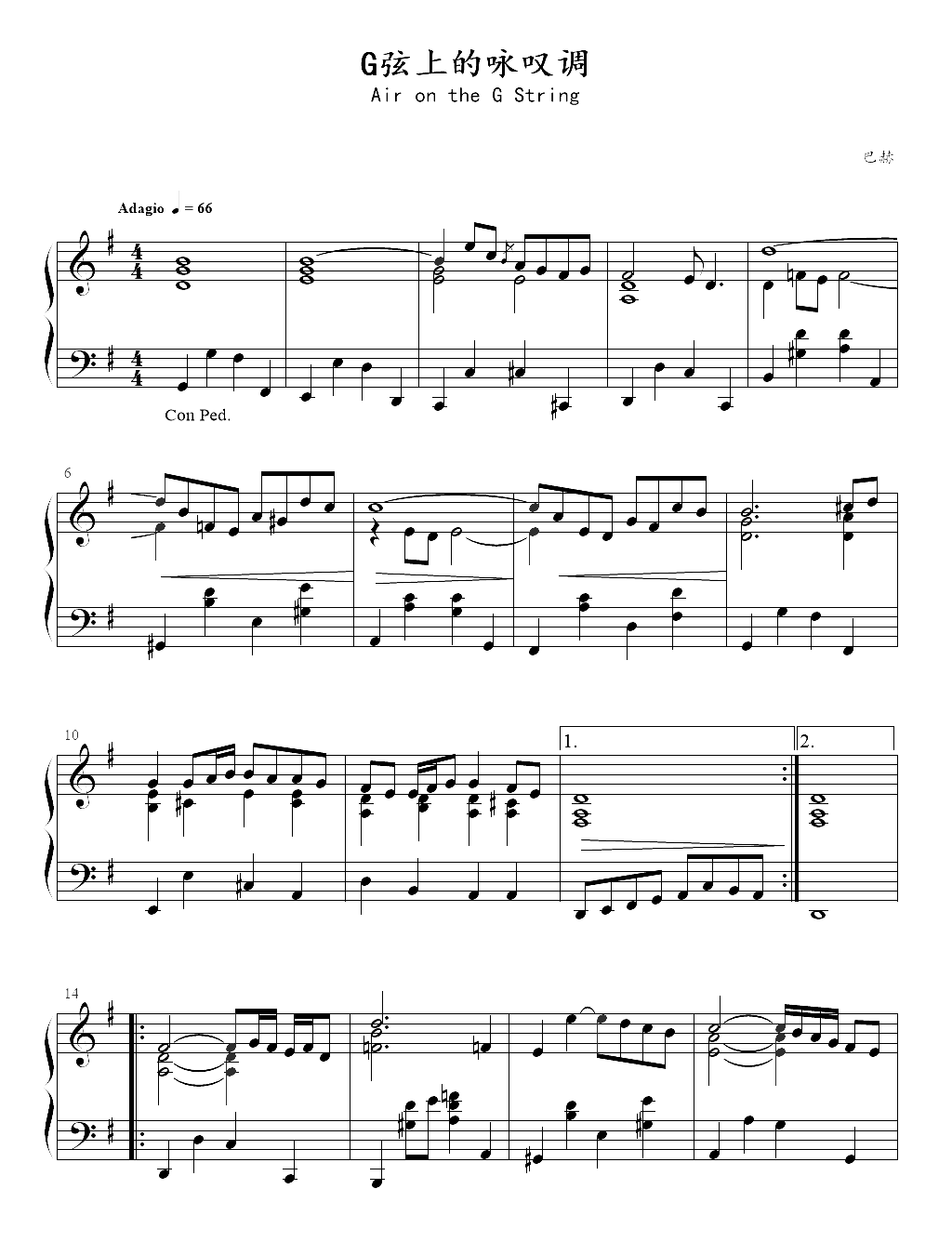 巴赫《G弦上的咏叹调》钢琴谱,采用G调指法编配,共有2张高清图谱,免翻页排版设计。...