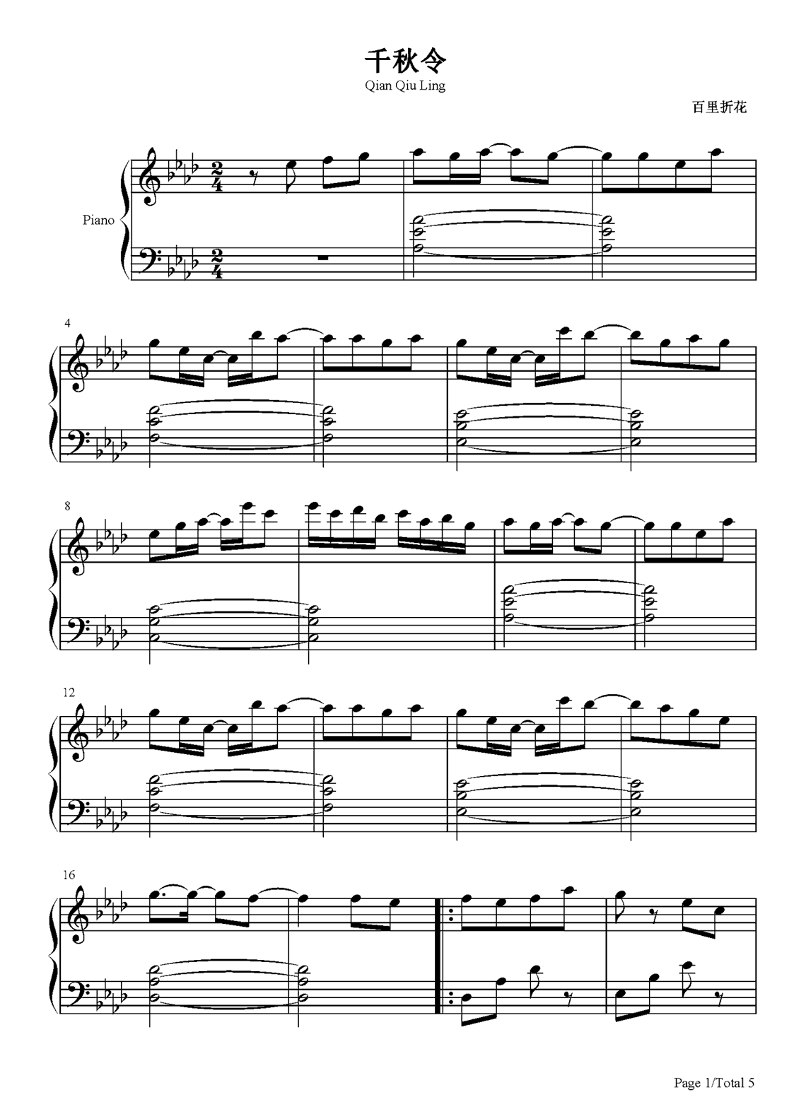银临《秋千令》钢琴谱,采用14调指法编配,共有5张高清图谱。...