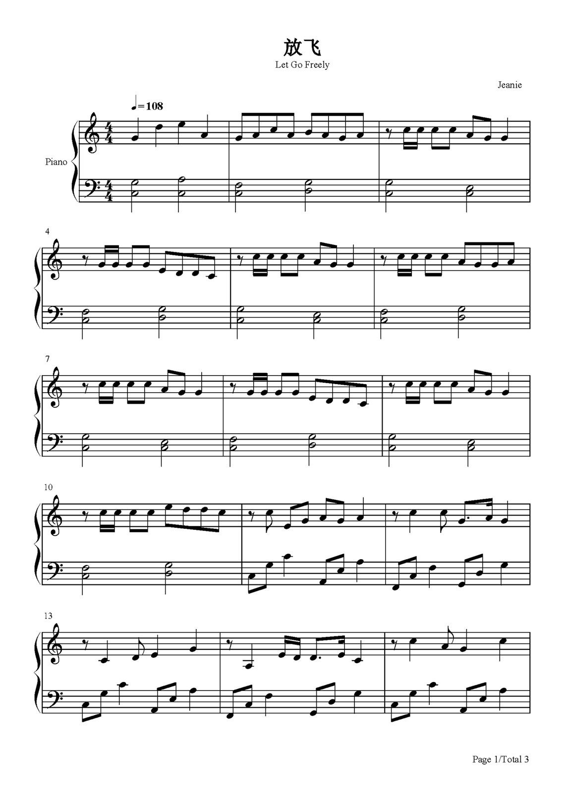 许嵩《放飞》钢琴谱,采用C调指法编配,共有3张高清图谱。...