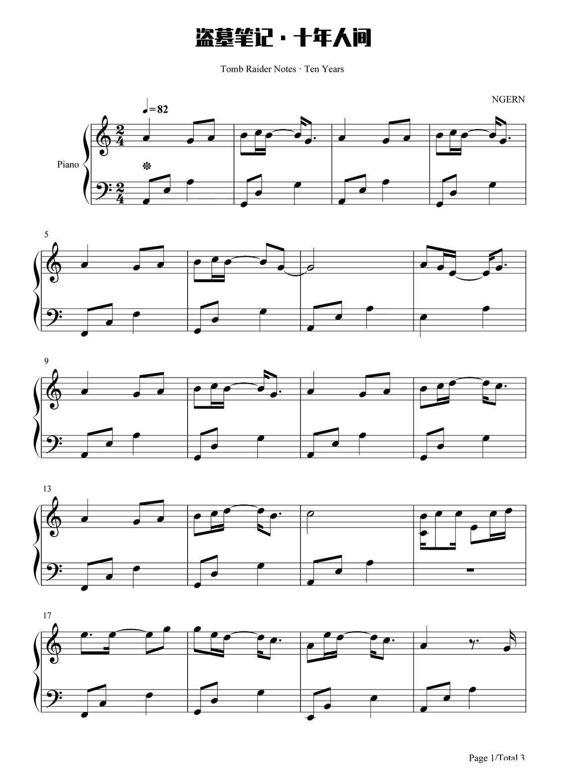 李常超《盗墓笔记·十年人间》钢琴谱,采用C调指法编配,共有3张高清图谱。...