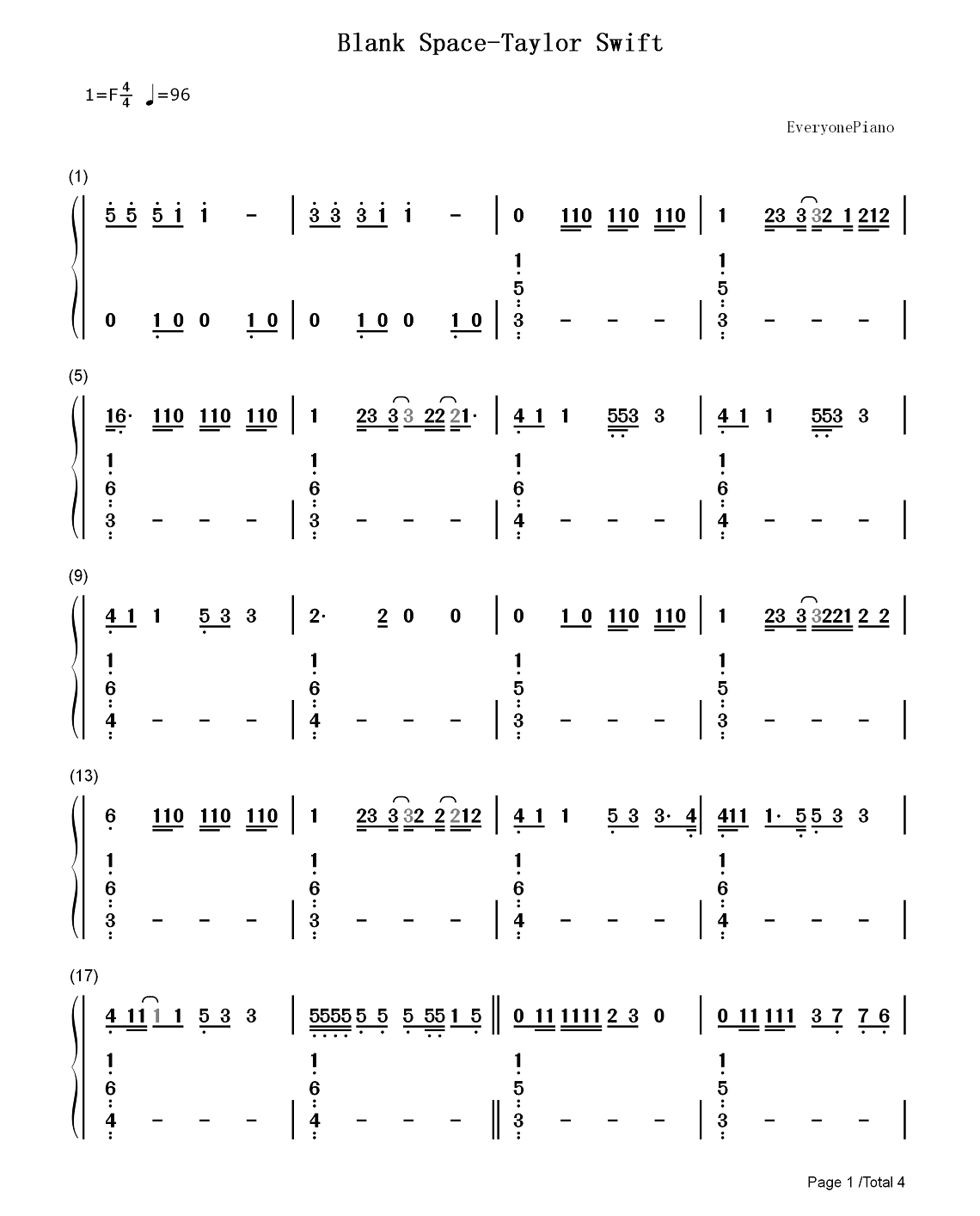 TaylorSwift《BlankSpace》钢琴谱,采用F调指法编配,共有5张高清图谱。...