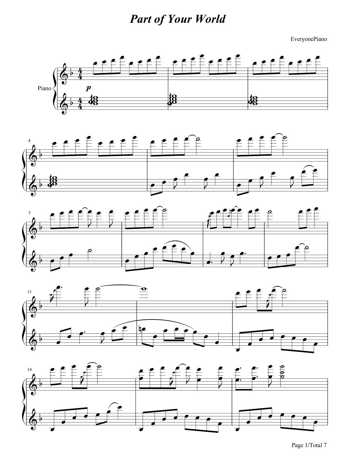 动画片《小美人鱼》钢琴谱,采用F调指法编配,共有7张高清图谱。...