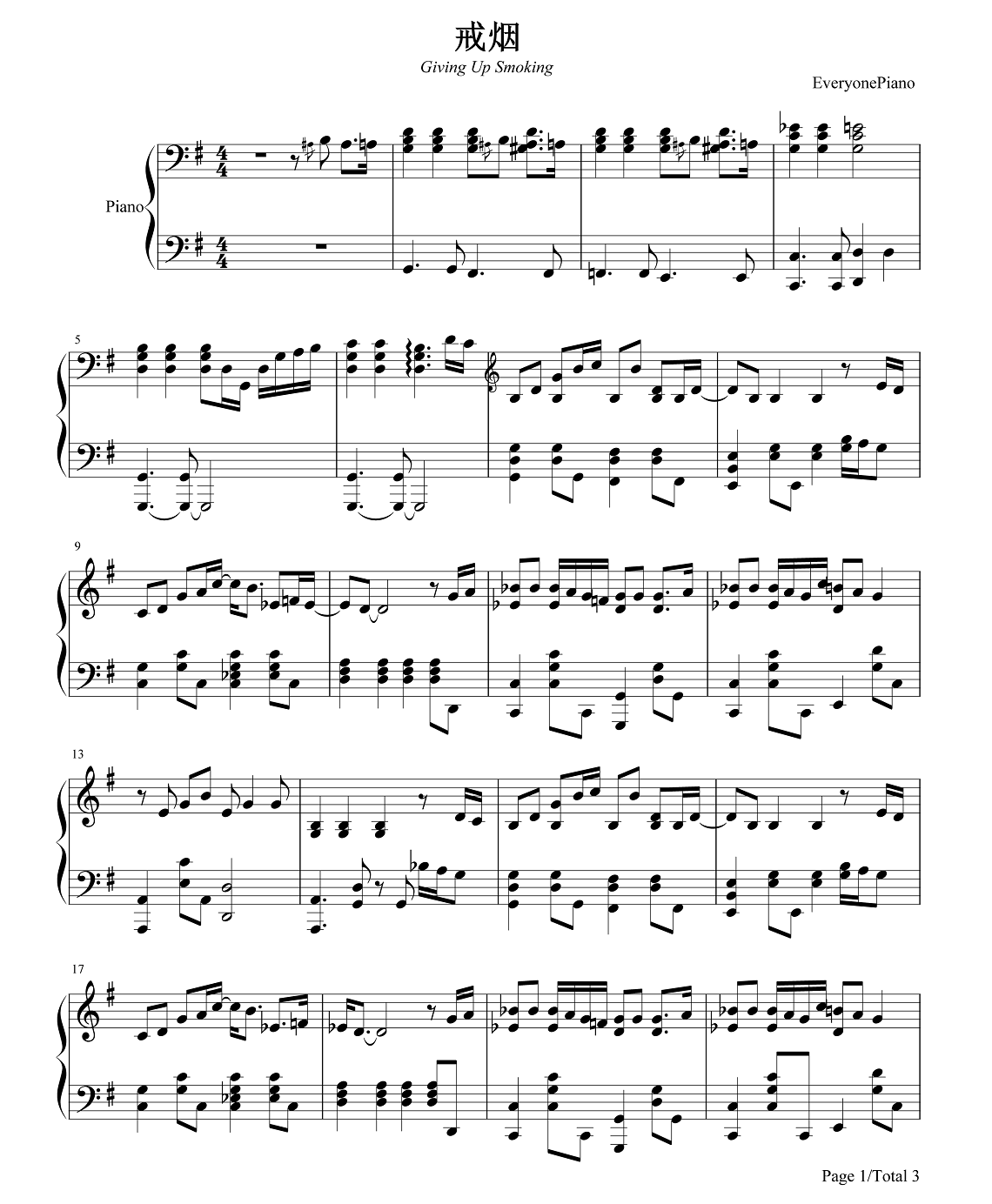 李荣浩《戒烟》钢琴谱,采用G调指法编配,共有3张高清图谱。...