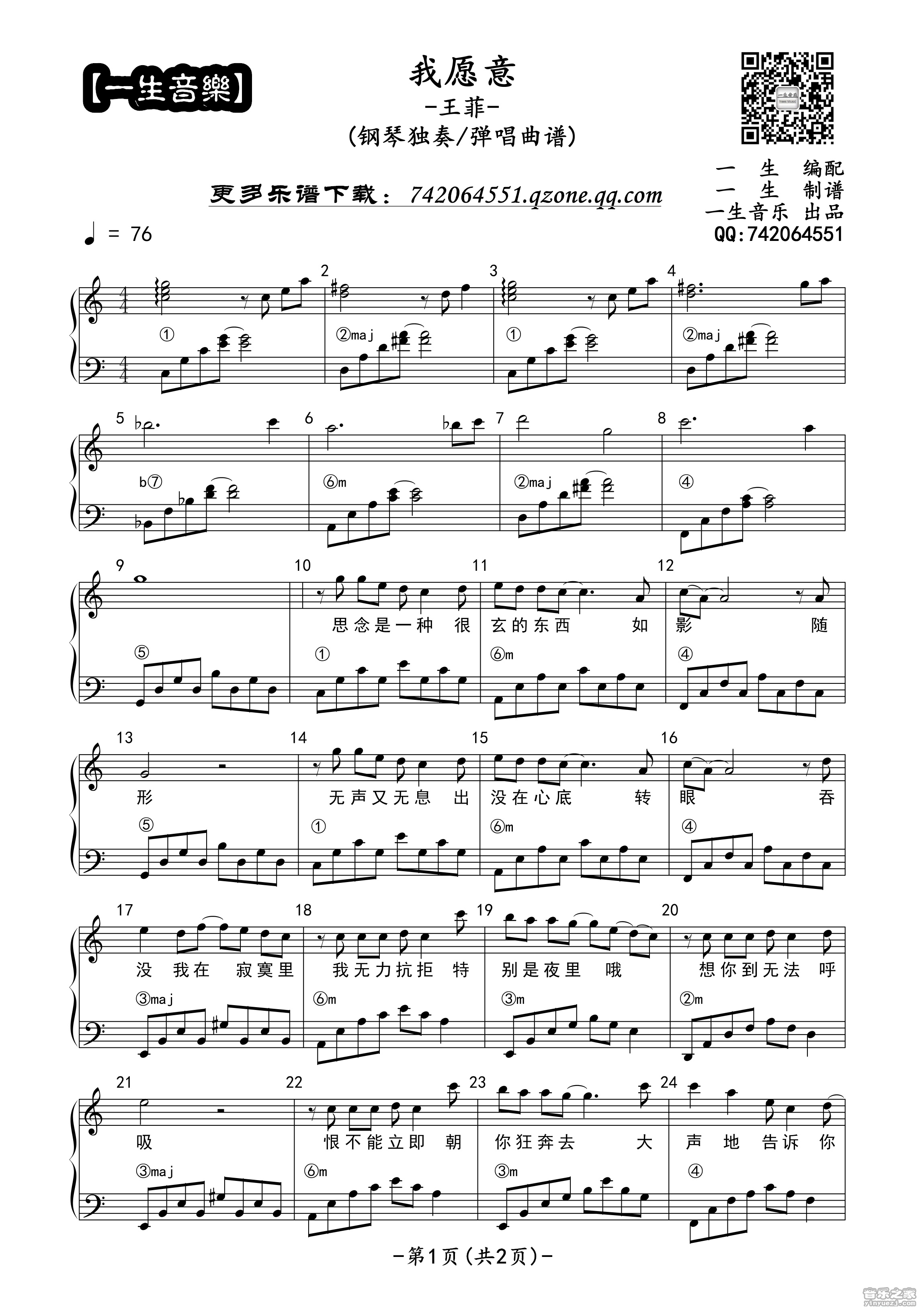 弹唱版王菲/王靖雯《我愿意》钢琴五线谱...