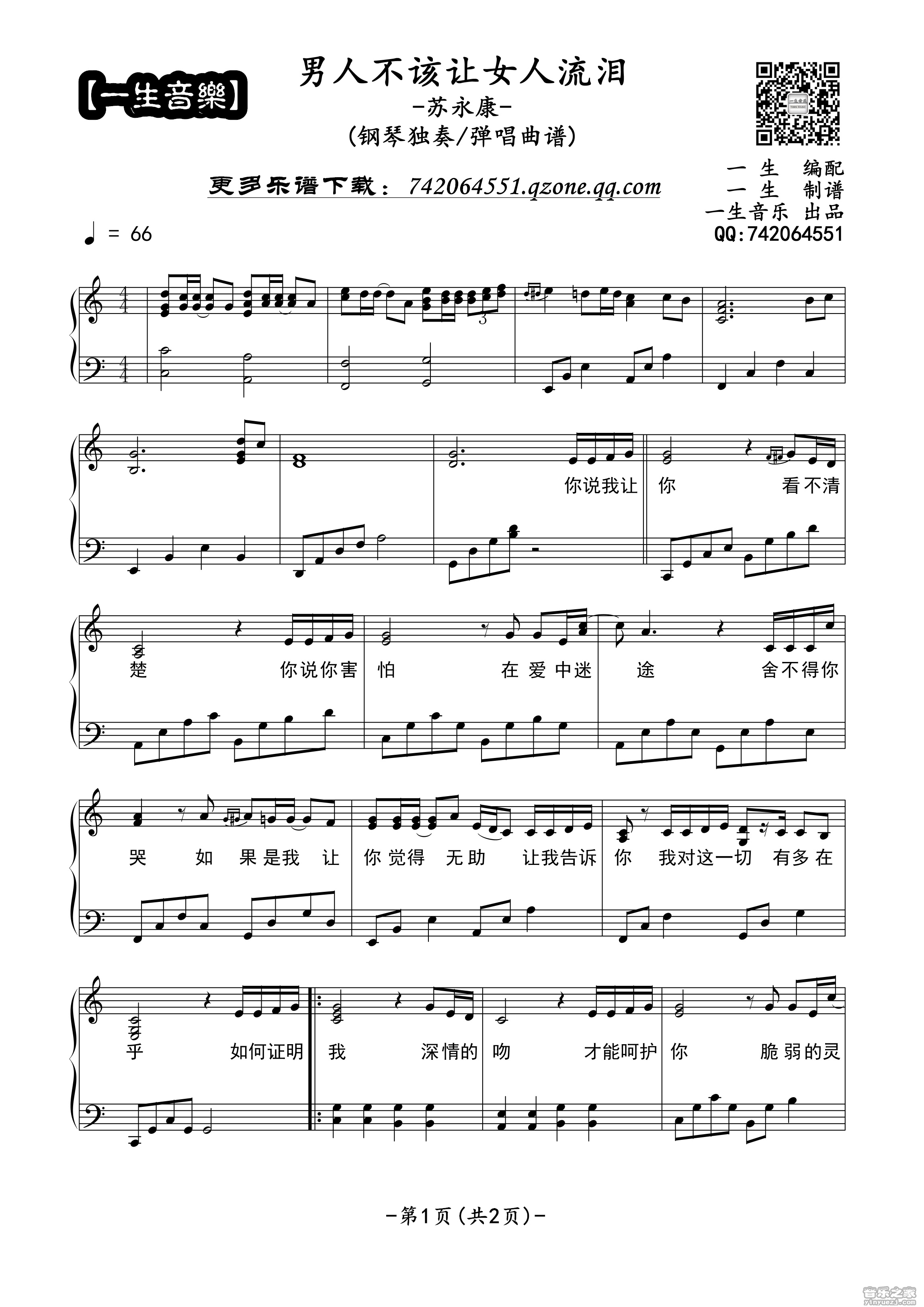 弹唱版苏永康《男人不该让女人流泪》钢琴五线谱...