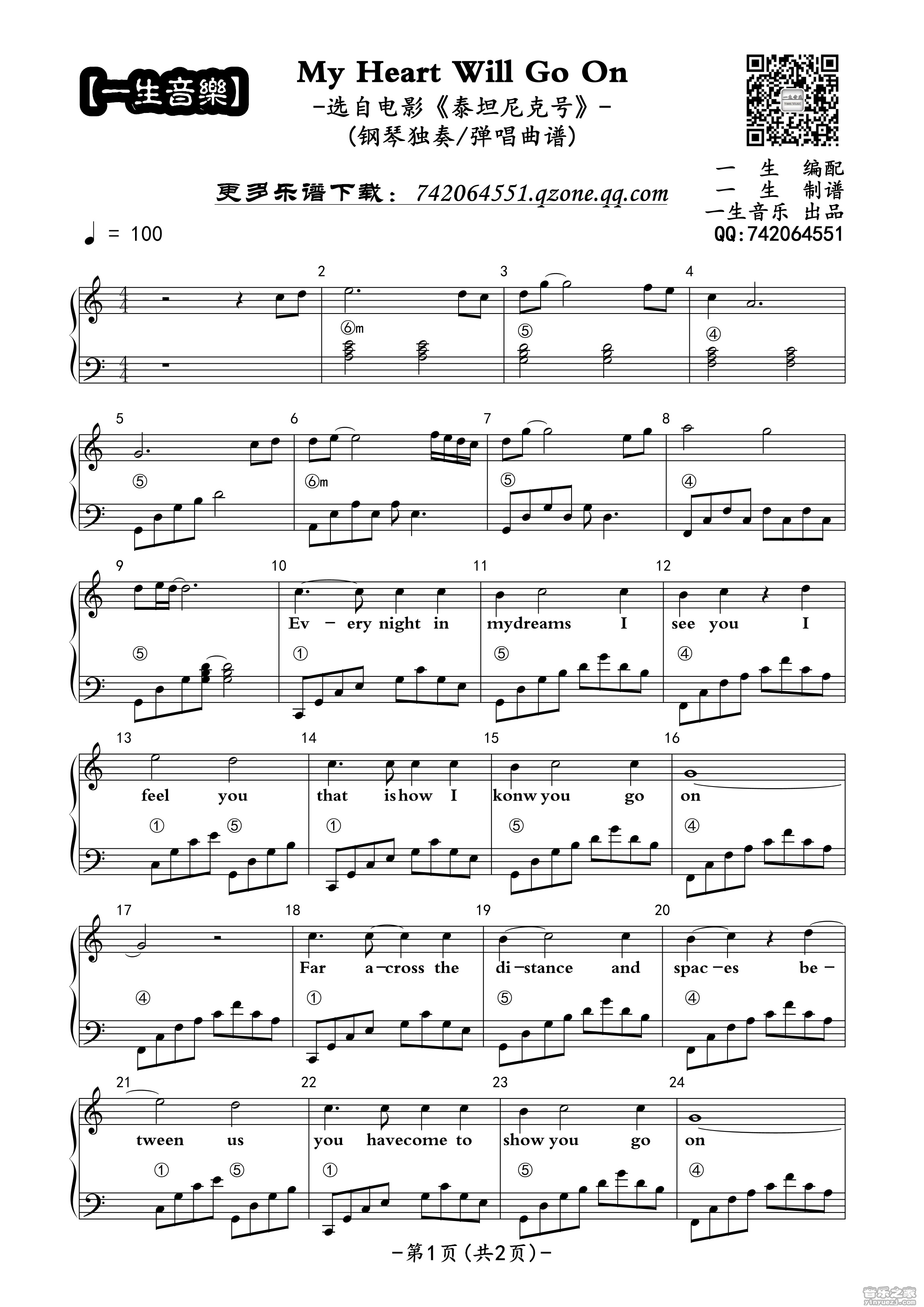 钢琴席琳·迪翁《My Heart Will Go On》钢琴五线谱