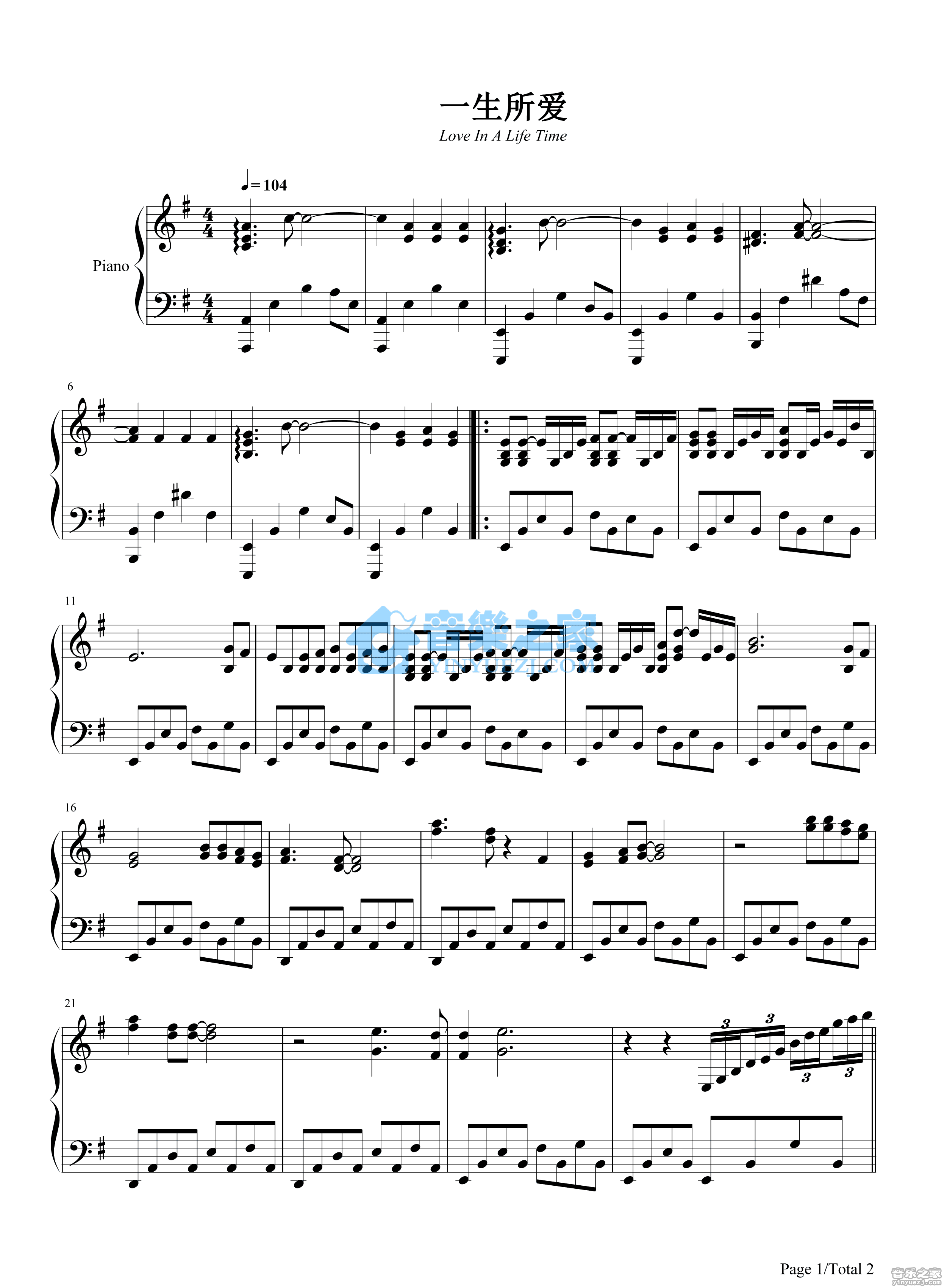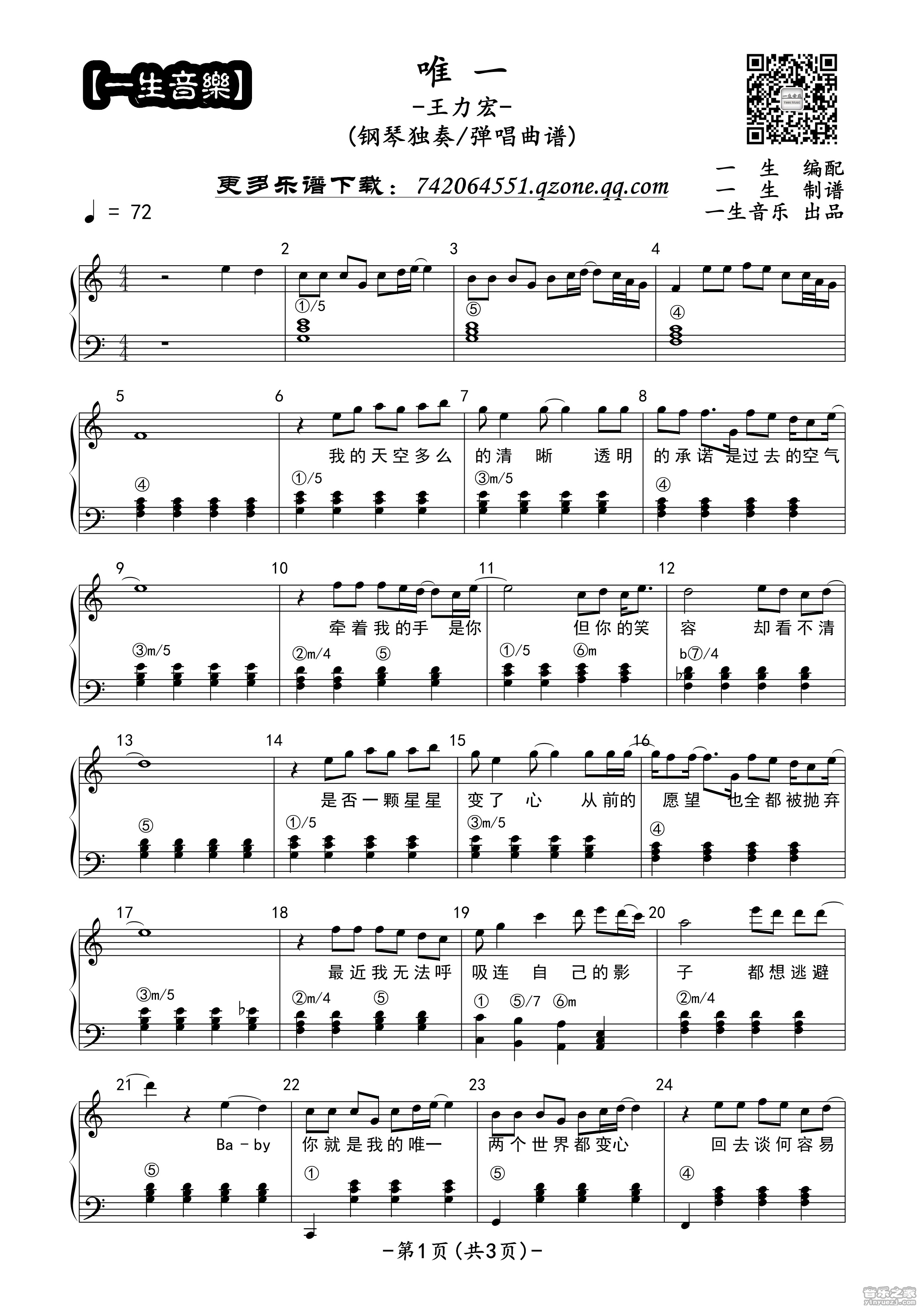 钢琴弹唱版 王力宏《唯一》钢琴五线谱