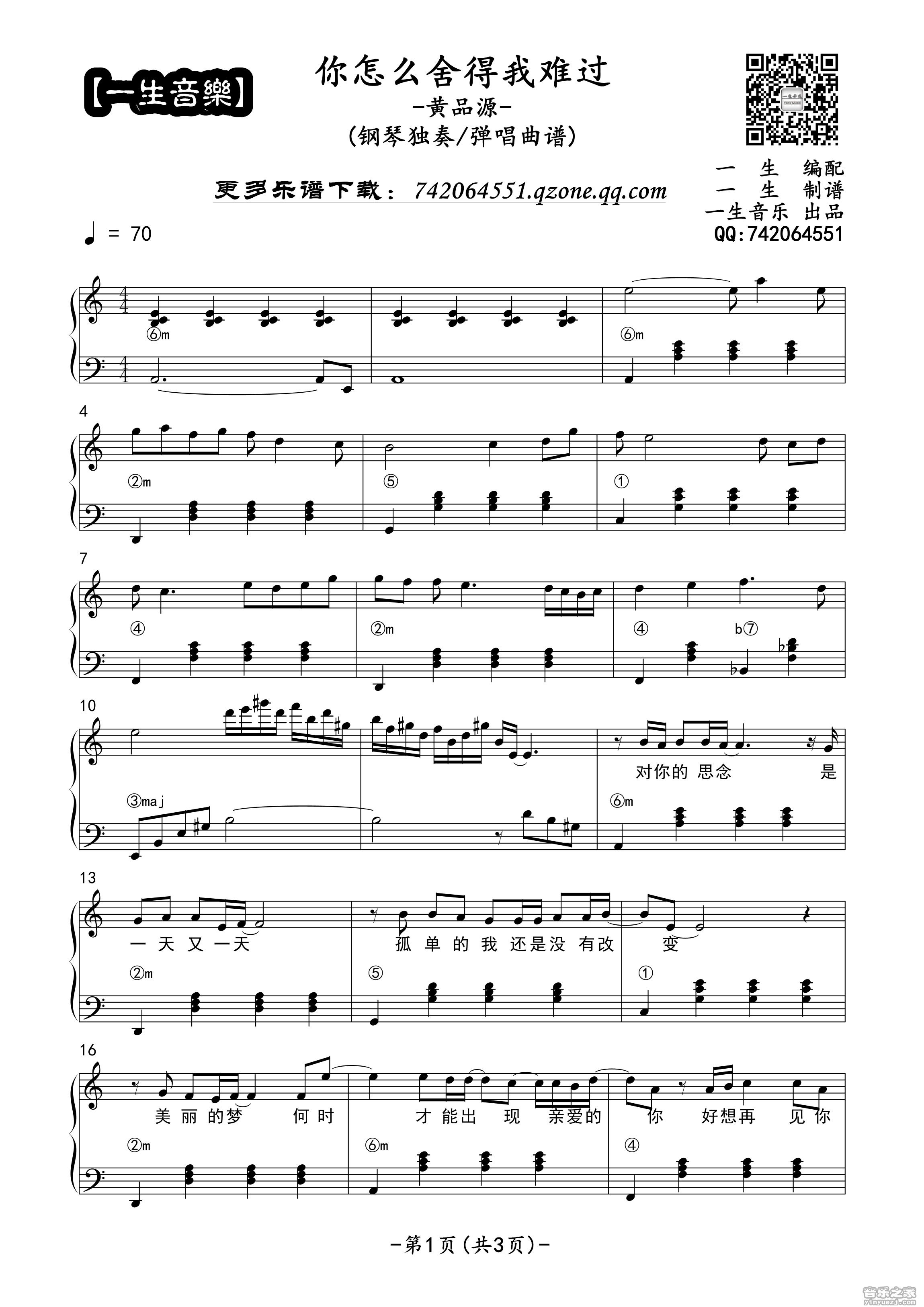 简单版黄品源《你怎么舍得我难过》钢琴五线谱...