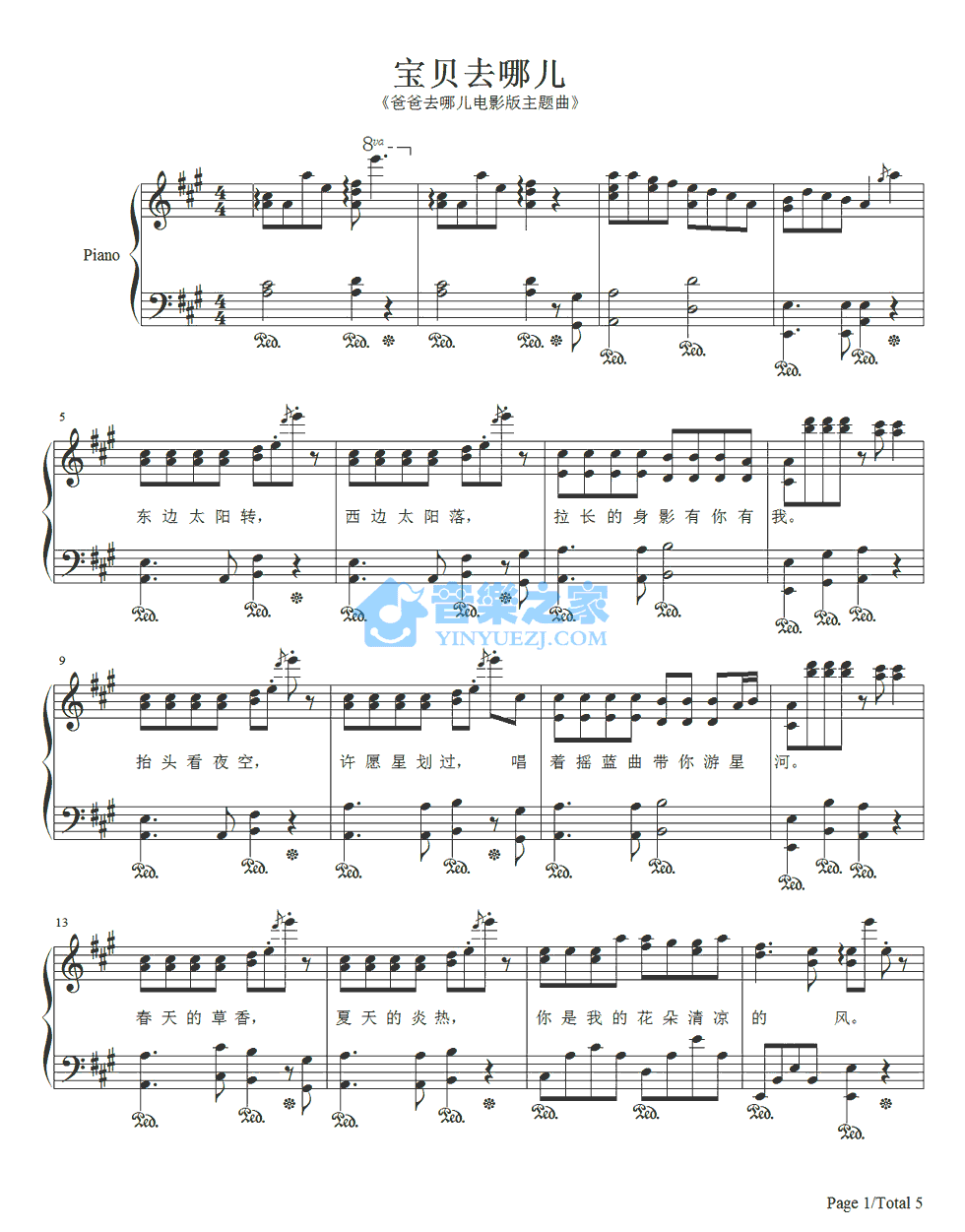 爸爸去哪儿电影版主题曲《宝贝去哪儿》钢琴五线谱...