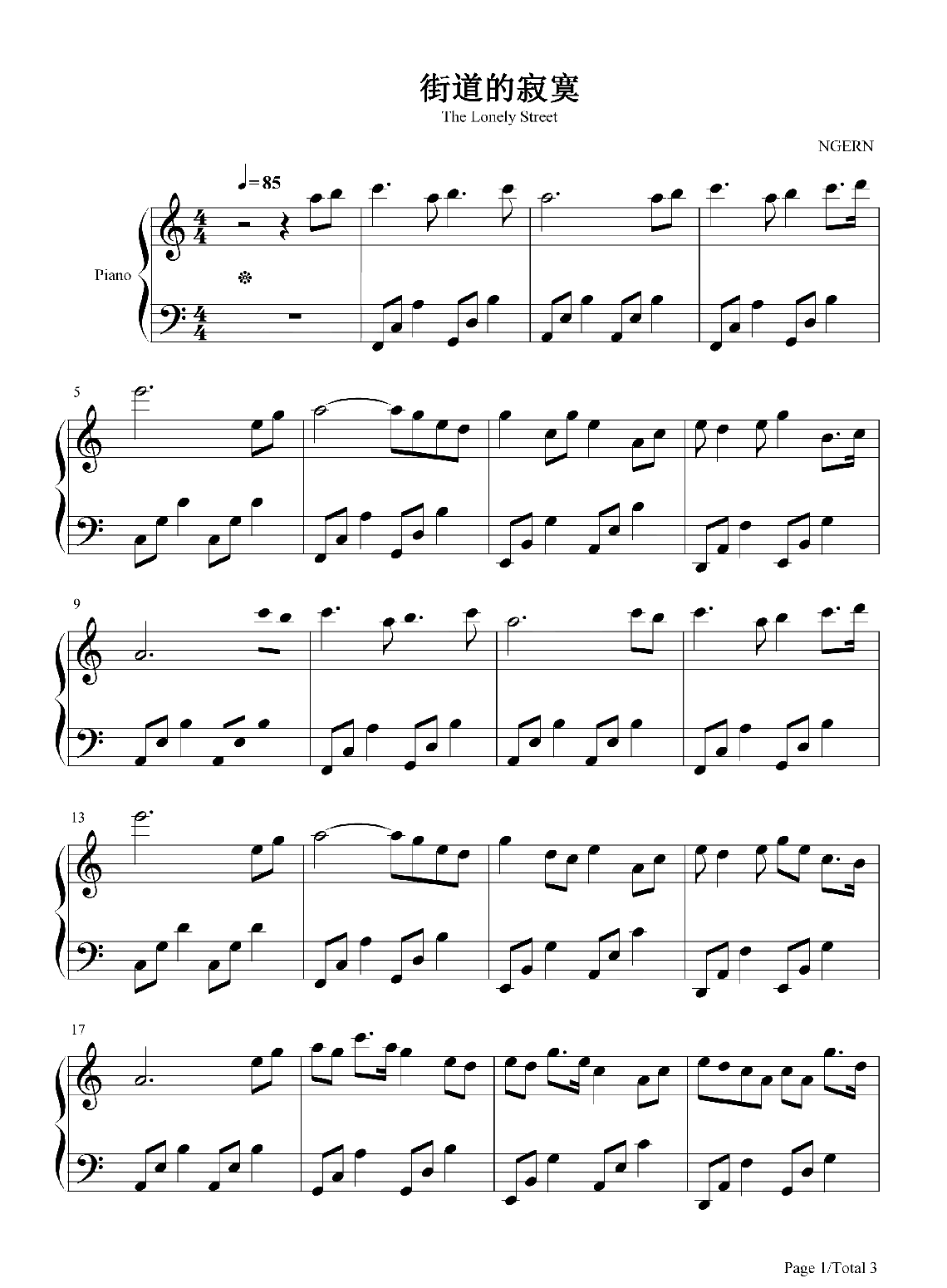 石进《街道的寂寞》钢琴谱(C调简单版)...