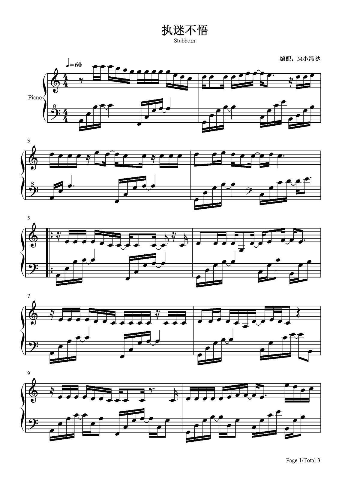 小乐哥《执迷不悟》钢琴谱(五线谱)...