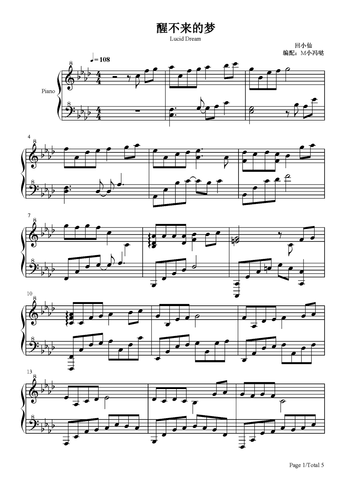钢琴回小仙《醒不来的梦》钢琴谱(五线谱/双手简谱)