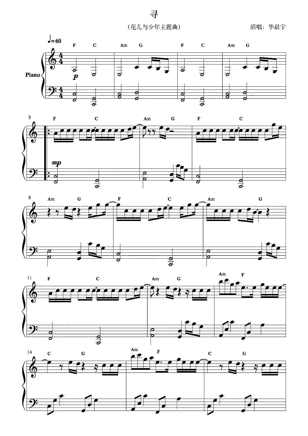 钢琴华晨宇《寻》钢琴谱(花儿与少年主题曲