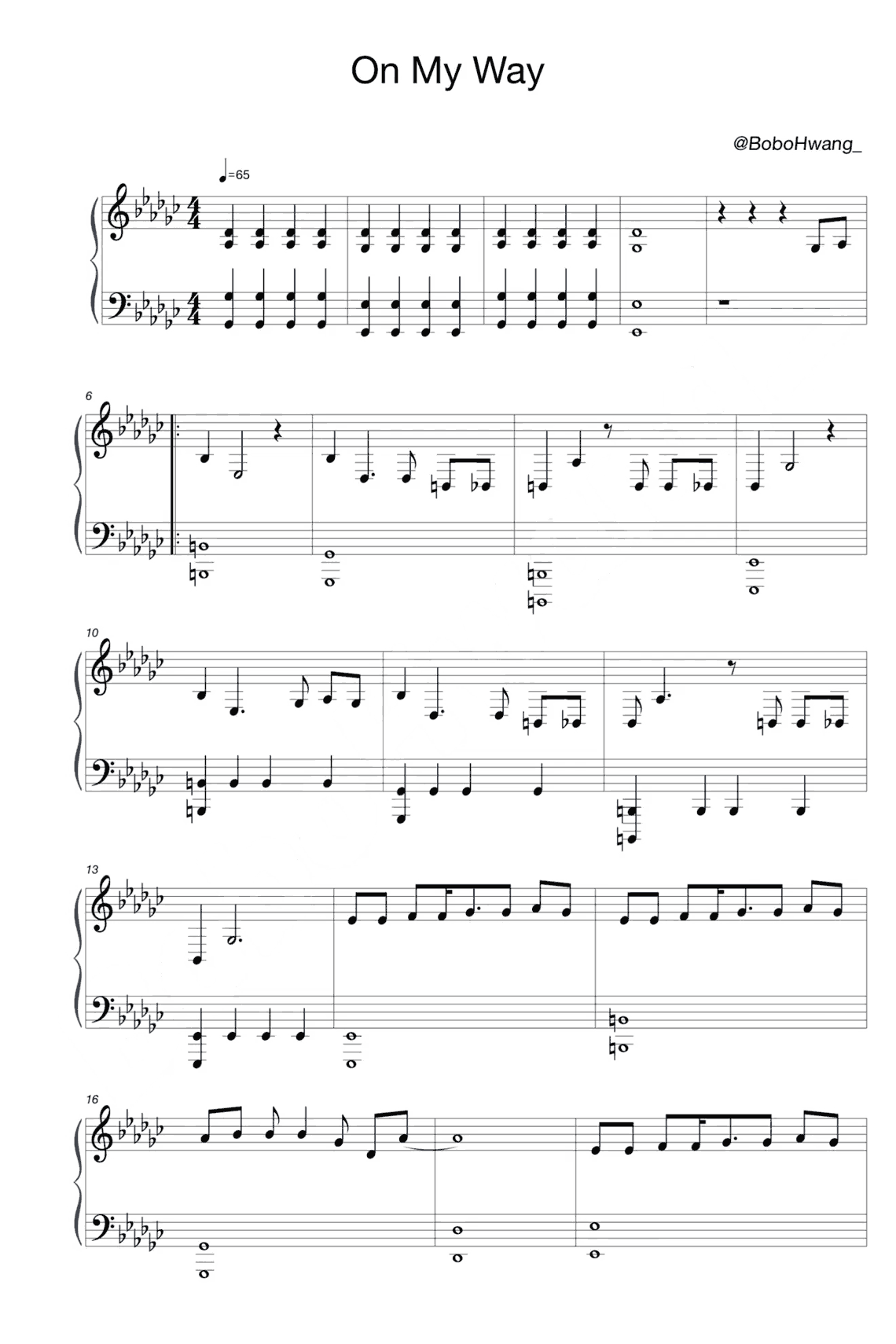 该曲谱是萨吉演唱的歌曲《Onmyway》钢琴谱,高清完整版共5张PNG图片五线谱,由B站up主@BoboHwang_编配。《Onmyway》钢琴谱和弦已简化,琴友们可以根据自己的喜好改编,欢迎练习。...